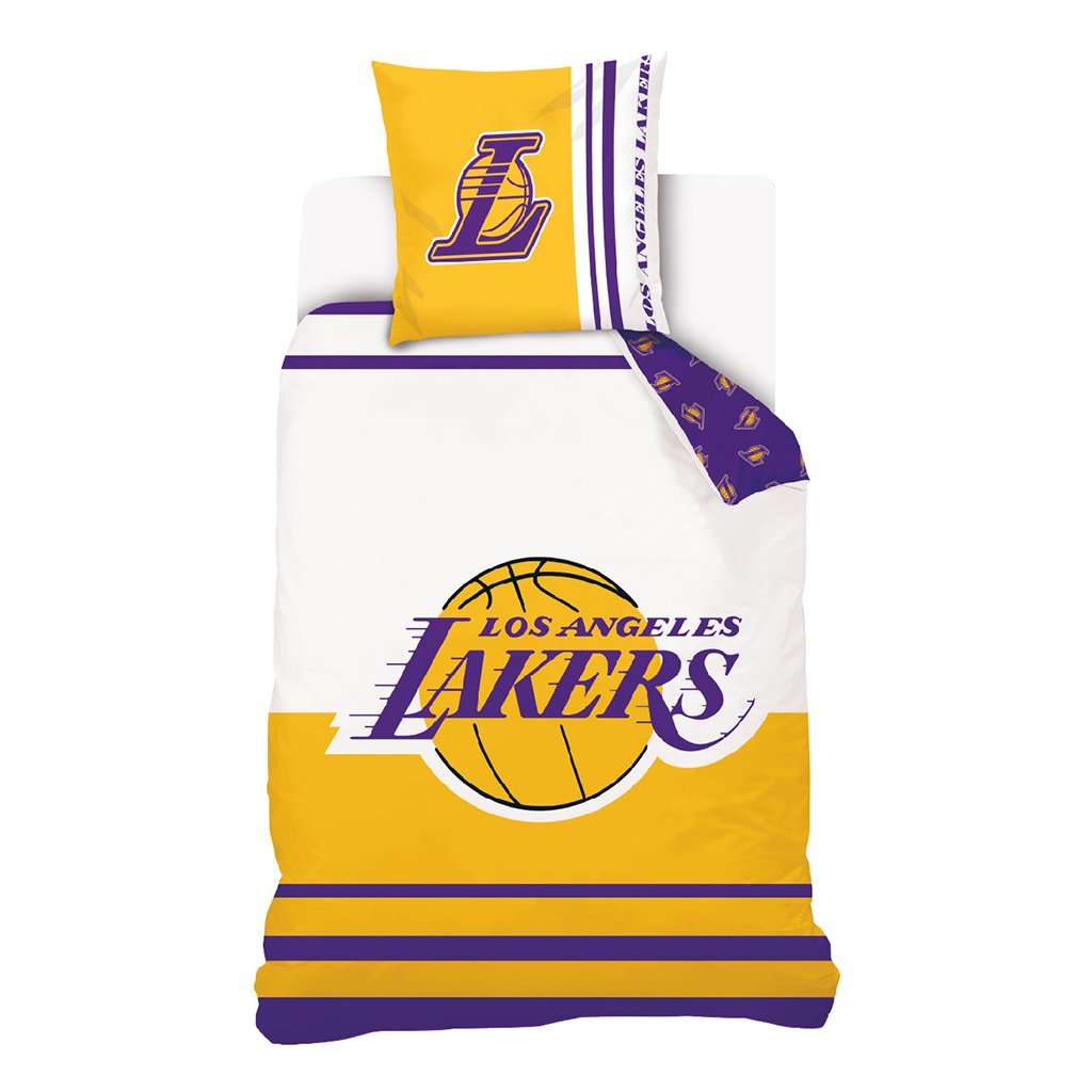Uprostřed povlaku na přikrývku je umístěn basketbalový míč, přes něj je nápis Los Angeles Lakers ve fialové barvě
