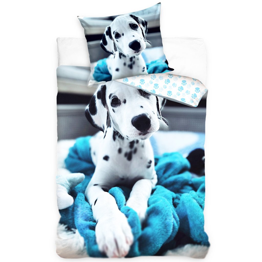 Bavlněné povlečení Dalmatin potěší všechny milovníky pejsků, jeho realistický potisk krásného štěněte s černými flíčky působí jako živý a promění dětský pokoj v útulné místo plné něhy