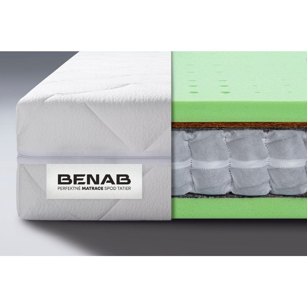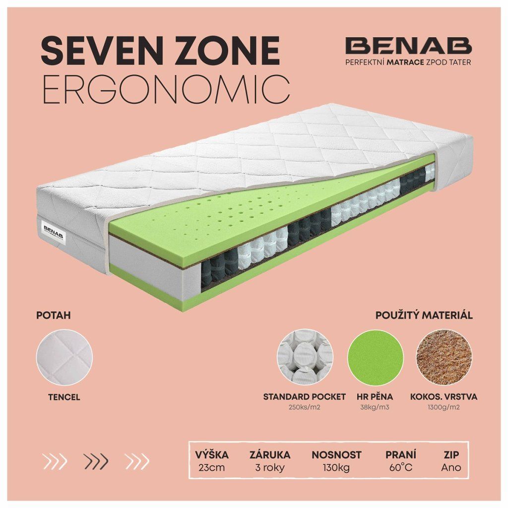 Vysoce kvalitní ortopedická matrace Seven Zone Ergonomic od renomovaného slovenského výrobce Benab se 7-zónovým taštičkovým jádrem od špičkového německého výrobce Agro v kombinaci s perforovanou HR studenou pěnou a přírodním kokosovým vláknem - řadí se k top matracím v kolekci. Výška matrace Seven Zone Ergonomic je 23cm, Tvrdost je tvrdá H4 / střední H3. Na matraci Seven Zone Ergonomic je 3 roky záruka. Nosnost matrace Seven Zone Ergonomic je 130kg.taštičkové jádro dokonale kopíruje tvar lidského těla, je složeno z malých samostatných pružinek v 7 zónách tvrdosti čo zvyšuje ortopedický efektmatrace dvojité tuhosti s jednostranným použitím kvalitní kokosové deskyvynikající provzdušnění jádra přes speciální odvětrávací systém, čímž zároveň nedochází k přehřátí organizmudoporučený rošt laťovýstandardní vyhotovení v potahu TencelHR 38 kg/m3, kokosová vrstva/1300 gr/m2, taštičková pružina 250 ks/m2 – 7 zónPotah TencelVysoce kvalitní potah špičkových parametrů vyrobený z hedvábné trikotové látky Tencel s použitím Vortex technologie, charakteristický svou vysokou vzdušností a odvodem vlhkosti. Rychle se vysušuje, čímž zabezpečuje vysokou hygienu a komfort matrace. Látka vyrobená z přírodních celulozových vláken Lyocell, je velmi pevný a má dlouhou životnost. Certifikovaný a zdravotně nezávadný OEKO-TEX standard. Složení 38% Lyocell, 37% Polyamid, 25% Polyester, Potah prošitý s klimatizační výplní, PES vláknem 300 gr/m2. Potah je přirozeně antibakteriální a antiroztočový, odzipovatelný a pratelný do 60 °C.O matracích BenabMatrace Benab jsou na slovenském a českém trhu už od roku 1998, kdy továrna pod Tatrami začala vyrábět perfektní matrace pro domácnosti, nemocnice, domy pro seniory i hotelová zařízení. Posláním každého produktu Benab je garantovat každému člověku v domácnosti zdravý spánek, pomáhat nemocným v jejich léčení a osobám na cestách a na dovolených dopřát pohodlný oddych.Benab nabízí široký sortiment matrací – od ekonomických, přeskomfortní až po špičkové inovativní matrace, konkurující světoznámým značkám, které jsou symbolem luxusu. Pružinové a hybridní matrace Benab jsou skvělým příkladem špičkové technologie, know-how a zručnosti zaměstnanců.Doplňkové parametry