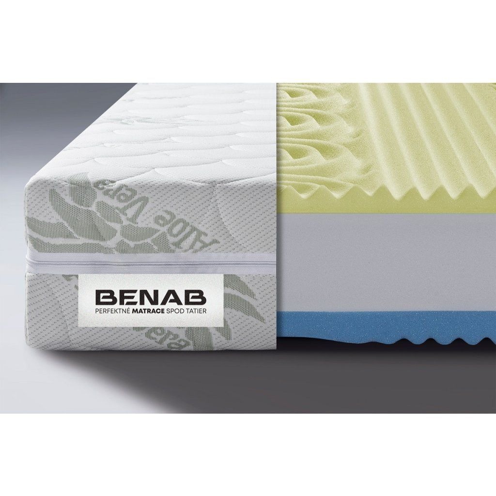 Velmi oblíbená zdravotní sendvičová a cenově dostupná matrace Visco Plus od renomovaného slovenského výrobce Benab z elastické paměťové pěny se 7 zónovou anatomickou profilací v kombinaci s jádrem PUR pěny. Visco (líná, paměťová) pěna s paměťovým efektem reaguje na teplo a tlak a optimálně se přizpůsobí křivkám vašeho těla a tím uvolňuje svalstvo a klouby. Matrace Visco Plus je oboustranně použitelná, profilovaná a cenově dostupná. Výška matrace Visco Plus je 18cm, Tvrdost je střední H3 / tvrdá H4. Na matraci Visco Plus je 3 roky záruka.povrch tvarovaný oboustranně masážní profilacídoporučený rošt lamelovýstandardní vyhotovení v potahu - Aloe VeraVisco 52 kg/m3 7 zón profil, PUR jádro 30 kg/m3, PUR 7 zón 30 kg/m3Potah Aloe VeraPotahová látka s výtažky z rostliny Aloe Vera obsahuje převážně enzymy, minerální látky a aminokyseliny, které velmi pozitivně působí na pokožku a posilují relaxační účinky spánku. Příjemně měkký se schopností regenerace pokožky lidského těla, vlastnosti této látky zaručují dostatečnou hygienu. Certifikovaný a zdravotně nezávadný OEKO-TEX standard. Složení: 85 % polyester; 15 % viskóza, obohacený o výtažky z Aloe Vera. Potah prošitý s klimatizační výplní, PES vláknem 250 gr/m2. Potah je antibakteriální, antiroztočový, odzipovatelný a pratelný do 60°C.O matracích BenabMatrace Benab jsou na slovenském a českém trhu už od roku 1998, kdy továrna pod Tatrami začala vyrábět perfektní matrace pro domácnosti, nemocnice, domy pro seniory i hotelová zařízení. Posláním každého produktu Benab je garantovat každému člověku v domácnosti zdravý spánek, pomáhat nemocným v jejich léčení a osobám na cestách a na dovolených dopřát pohodlný oddych.Benab nabízí široký sortiment matrací – od ekonomických, přeskomfortní až po špičkové inovativní matrace, konkurující světoznámým značkám, které jsou symbolem luxusu. Pružinové a hybridní matrace Benab jsou skvělým příkladem špičkové technologie, know-how a zručnosti zaměstnanců.Doplňkové parametry