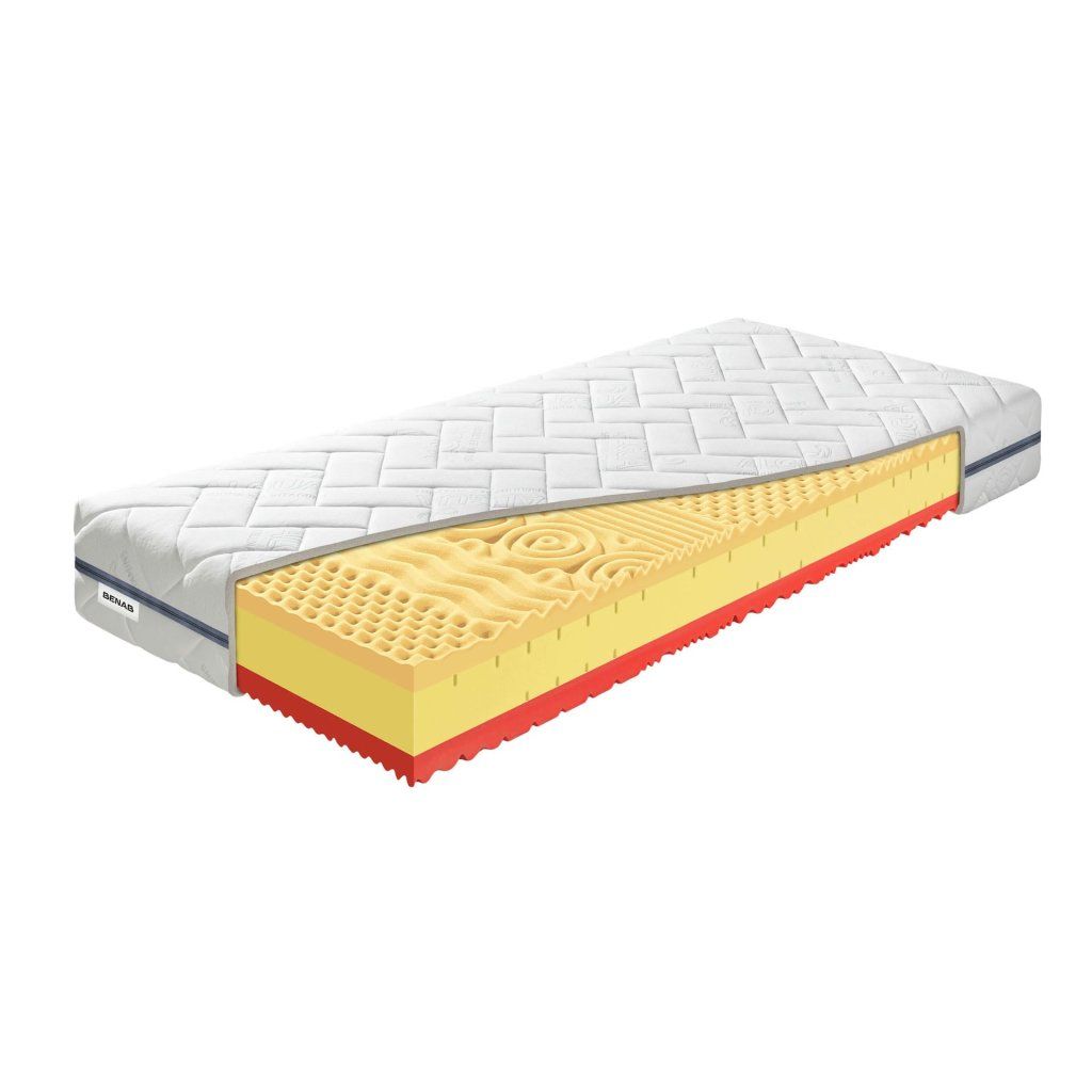 Pokud hledáte matraci s paměťovou línou pěnou, pak matrace Benab Zero Visco 23 Bio musí být vážným kandidátem - perfektní 5 cm silná Visco pěna, antibakteriální odvětrané Sanitized® jádro, kvalitní potah s výtažky řas Spirulina a k tomu za super cenu.Matrace Benab Zero Visco 23 Bio je kombinací 5 cm silnou vrstvou paměťové Visco pěny se 7 zónovou masážní profilací, speciálně odvětraným jádrem z moderní antibakteriální, vysoce pružné pěny Sanitized® s dlouhou životností a sekundární ložnou vrstvou z kvalitní 7 zónově profilované PUR pěny. Visco pěna s paměťovým efektem reaguje na teplo a tlak a optimálně se přizpůsobí křivkám vašeho těla, a tím uvolňuje svalstvo a klouby. Speciální antibakteriální pěna s ventilačními otvory s certifikovanou úpravou Sanitized® (biocidní látka- nezávadná vhodná i pro děti do 3 let) likviduje bakterie, houby, roztoče, plísně a další nežádoucí mikroorganismy. Doporučený rošt pro matraci Benab Zero Visco 23 Bio je lamelový.Konstrukce matrace Benab Zero Visco 23 BioŽlutá, 7 zónová profilovaná deska z Visco pěny o hustotě 50 kg/m³ vysoká 3 až 5 cm,žluté, 11 cm vysoké perforované 7 zónové jádro z antibakteriální pěny Sanitized® o hustotě 40 kg/m³ ,červená 7 zónová profilovaná vrstva z PUR pěny o hustotě 28 kg/m³ vysoká 3 až 5 cm.Matrace je lepena technologií HotMelt - eko lepení známé jako tavné lepidlo. Používá se i v potravinářství. Tento způsob je ekologický, absolutně bez zápachu a lepený spoj ani po letech neztrácí svou pevnost. Certifikát ECOPASS o zdravotní nezávadnosti.Potah Algua SpirulinaPotah s výtažky z mořských řas Spirulina. Obsahuje přírodní vitamíny, minerály a aminokyseliny. Během spánku dochází k uvolňování těchto látek a působí blahodárně na lidskou pokožku. Potah má antibakteriální, antimykotické vlastnosti - zabraňuje tvorbě a růstu plísní. Vlastnosti potahu Algua Spirulina zaručují vynikající hygienu. Certifikovaný a zdravotně nezávadný OEKO-TEX standard. Odzipovatelný a pratelný do 60 °C.Složení: 30% viskóza, 70% polyester, úprava Spirulina Finish, zónově prošitý s klimatizační výplní, PES vláknem 300 gr/m².O matracích BenabMatrace Benab jsou na slovenském a českém trhu už od roku 1998, kdy továrna pod Tatrami začala vyrábět perfektní matrace pro domácnosti, nemocnice, domy pro seniory i hotelová zařízení. Posláním každého produktu Benab je garantovat každému člověku v domácnosti zdravý spánek, pomáhat nemocným v jejich léčení a osobám na cestách a na dovolených dopřát pohodlný oddych.Benab nabízí široký sortiment matrací – od ekonomických, přeskomfortní až po špičkové inovativní matrace, konkurující světoznámým značkám, které jsou symbolem luxusu. Pružinové a hybridní matrace Benab jsou skvělým příkladem špičkové technologie, know-how a zručnosti zaměstnanců.Doplňkové parametry
