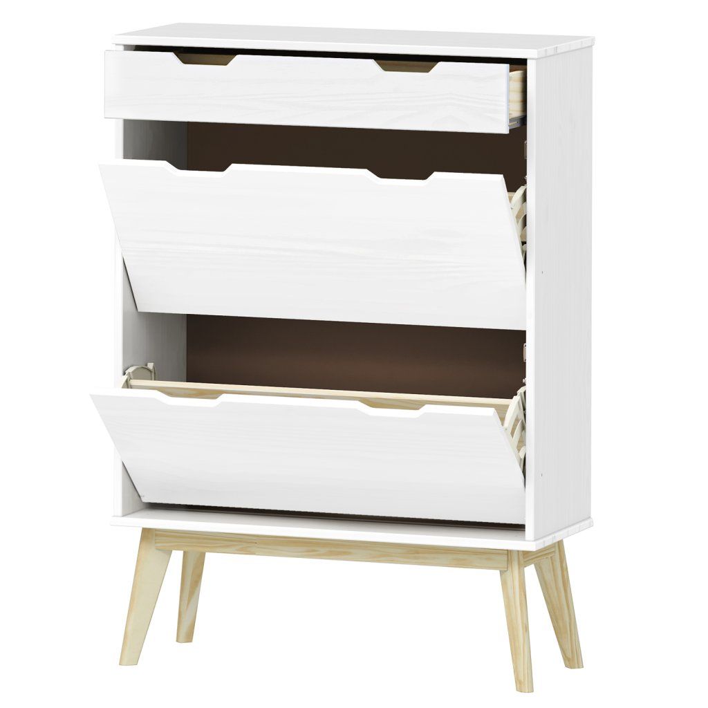 materiál masiv borovice, barevné provedení bílý lak 1 zásuvka s kovovými pojezdy, 2 dvouřadé výklopyDoplňkové parametry