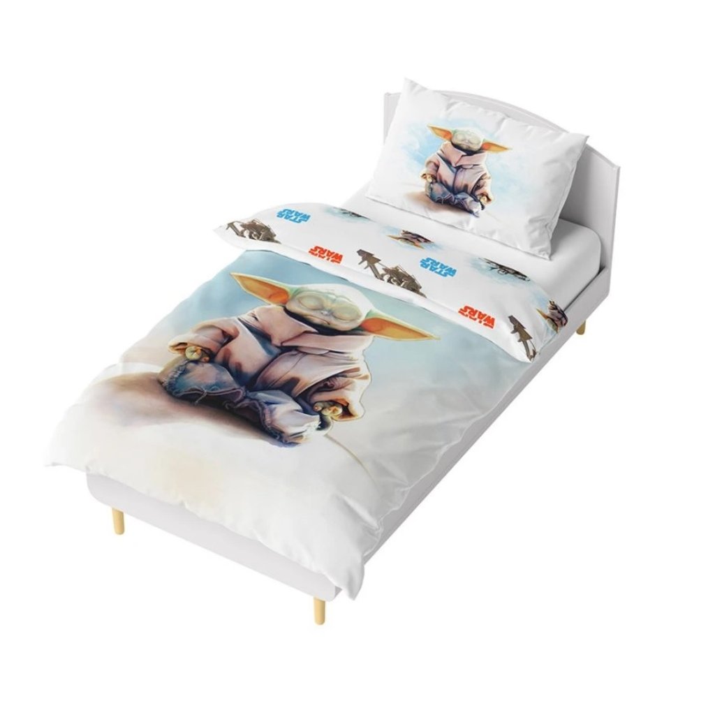 Na lícní straně povlaku přikrývky vidíme malého Yodu, známého také jako Grogu, který vypadá jakoby spinkal