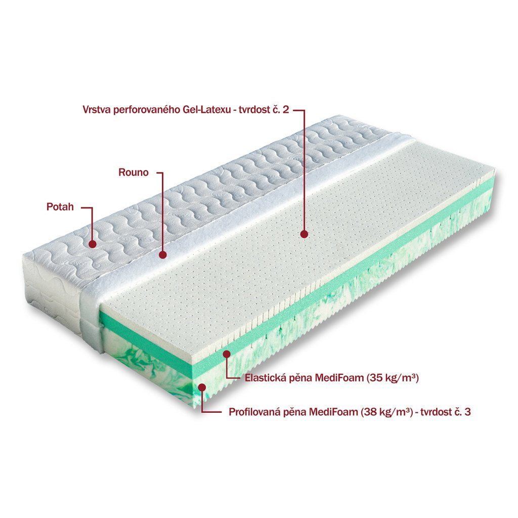 Nosná vrstva matrace Andros firmy Dřevočal, která je označena tuhostí H2, je měkčí a poddajnější díky unikátnímu typu perforovaného Gel-Latexu, který má díky mikro-kapslím speciálního gelu chladivý efekt. Je měkký, tvarově stálý, a díky výborným termoregulačním vlastnostem dobře odvádí vlhkost. Střed jádra tvoří červená antibakteriální pěna s gramáží 32 kg/m³ s úpravou Sanitized®, která poskytuje trvalou a účinnou ochranu proti bakteriím a roztočům. Otočením získáte tvrdší stranu s tuhostí H3 tvořenou odolnou pěnou MediFoam o hustotě 32 kg/m³ se speciálními zářezy ve tvaru Y v místech největšího zatížení (oblast ramen). Matrace Andros se dokonale přizpůsobí křivkám ležícího těla. Matrace je vhodná na všechny typy roštů. Celková výška matrace Andros je 23 cm.Gel-Latex - Unikátní typ perforovaného latexu, který má díky mikro kapslím speciálního gelu chladivý efekt. Má 4x větší počet pórů než klasický latex. Je měkký, tvarově stálý a hypoalergenní, eliminuje výskyt roztočů a plísní. Má jedinečné ortopedické vlastnosti, skvěle se přizpůsobuje tvarům těla a také odvádí vlhkost díky výborným termoregulačním vlastnostem.Pěna MediFoam - Tato vysoce gramážní pěna, která se vyznačuje skvělými ortopedickými vlastnostmi, je vytvořena speciální technologií. Má dokonalou prodyšnost, pružnost, je tvarově stálá a má dlouhou životnost. Zvýšená pórovitost je velmi dobrá k odvádění tepla z matrace, tato pěna tzv. dýchá. Matrace z pěny MediFoam zajišťují ideální uvolnění páteře, kloubů a svalů po dobu Vašeho spánku. Jsou testované a mají certifikát Textilního zkušebního ústavu, s.p. v Brně. Pěna MediFoam je garancí kvality.Antibakteriální pěna Sanitized® - Speciální antibakteriální pěna s certifikovanou úpravou Sanitized® (biocidní látka- nezávadná, vhodná i pro děti do 3 let), která likviduje baktérie, houby, roztoče, plísně a další nežádoucí mikroorganismy v matraci. Je dermatologicky testována a šetrná vůči pokožce. Matrace z této pěny jsou díky antimikrobiální úpravě Sanitized® jsou revolučním řešením pro alergiky.Vlastnosti potahůÚpletVysoce kvalitní potah prošitý dutým vláknem. Potah je velmi příjemný na dotek, výborně odvádí vlhkost z těla a rychle vysychá. Potah je možno prát na 60°C. Pro snadnější praní a manipulaci je potah dělitelný zipem na dvě části. Tento nejprodávanější potah poskytuje vysoký standard celé matrace. Složení: 100% polyester.AloeVeraKvalitní potah, který obsahuje výtažek známé rostliny Aloe Vera Barbaensis z rodu liliovitých. Má pozitivní vliv na pokožku lidského těla, působí antibakteriálně. Postupně se uvolňující extrakt z AloeVera umožňuje dokonalou relaxaci ve spánku. Potah, prošitý třízónovým způsobem, je příjemný na dotek a standartně vetkané logo zaručuje nezaměnitelnost výrobku. Potah je pratelný na 60°C. Složení: 100% polyester.SilverGuardSilverGuard je jedinečná technologie, která zaručuje trvalou svěžest a hygienu během spánku. Eliminuje bakterie způsobující zápach a chrání před jejich usazováním. Ochrana je trvalá i po častém praní a čištění. Při kontaktu s pokožkou zachovává její přirozenou rovnováhu. Tento potah obsahuje přírodní viskózové vlákno, které ve spojení s moderním designem dodává textilii luxusní charakter. Zaručuje vám absolutní čistotu a pohodlí. SilverGuard® úprava: Využívá stříbro jako jeden z nejstarších a nejznámějších způsobů ochrany před houbami a bakteriemi. Díky působení stříbrných iontů chrání textilii před mikroorganismy a zabraňuje jejich rozvoji přírodní cestou. SilverGuard® zajišťuje konstantní svěžest a hygienu lůžka, vysokou odolnost proti oděru a žmolkování. Potah je pratelný na 60°C. Složení: 35% viskóza, 2% polyamid, 63% polyester.LyocellMateriál z čistého přírodního vlákna získaného ze dřeva technologií šetřící životní prostředí. Se všemi svými vynikajícími charakteristikami Vám poskytuje během spánku optimální pohodlí. K jeho předním vlastnostem patří vysoká absorpční schopnost a velmi rychlé odpařování. Tyto vlastnosti zaručují dokonalý pocit i pro osoby s vyšší potivostí. Mikrovlákna Lenzing Lyocell dodávají látce hedvábný lesk a jsou odolná a necitlivá k mikroorganismům. Potah je možno prát při 60°C. Složení potahu: 44% lyocell, 33% polyamid, 23% polyester.MedicottZnačkový typ pleteného potahu, který svým speciálním složením zabraňuje tvorbě a usazování domácích roztočů a tvorbu plísní. Roztoči žijí v tmavém, vlhkém a málo odvětrávaném prostředí, a tomu přesně odpovídá vaše postel. Hlavní obživou pro roztoče jsou odpadávající buňky vaší kůže. Ty jsou rozkládány plísněmi a tak se stávají stravitelnými pro prachové roztoče. Plíseň samotná způsobuje alergie spojené s dýchacími symptomy. Medicott je účinná složka látky, která zabraňuje v bavlně nebo v látkách s bavlněným základem vzniku plísní a současně přežití prachových roztočů. Medicott má vynikající antibakteriální účinky, které jsou dosaženy bez přídavku chemických látek. Tajemství úspěšného fungování spočívá v odstranění nečistot z vláken přírodní bavlny, čímž se zamezí potencionálnímu domovu plísní. Potah má dlouhotrvající účinek při pravidelné údržbě. Potah je pratelný na 60°C. Složení: 40% bavlna, 35% polyamid, 25% polyester.LevanduleVelmi příjemná luxusní látka, která obsahuje výtažky levandule lékařské. Levandule je oblíbená léčivá bylinka s charakteristickou vůní, známá pro svoje protizánětlivé, antiseptické a repelentní účinky. Pomáhá 