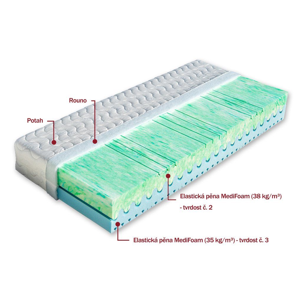 Luxusní matrace Atlanta s výškou 25 cm Vás zaujme svou modrou žíhanou pěnou Cellflex. Jedná se o komfortní studenou HR pěnu se speciálními vlastnostmi. Cellflex je extrémně pružná a dokáže se ideálně přizpůsobit všem detailům lidského těla. Je měkčí a poddajnější než polyuretanová pěna na druhé straně matrace Atlanta, proto u této matrace můžete využít volbu dvojí tvrdosti jednotlivých stran. Obě pěny jsou extrémně prodyšné a udržují jádro matrace Atlanta vždy suché a odolné vůči mikroorganismům. Důmyslný antidekubitní prořez ložných ploch matrace vyhovuje i osobám dlouhodobě upoutaným na lůžko, protože se ideálně tvaruje podle každé polohy ležícího těla a zabraňuje vzniku proleženin. Celková výška matrace Atlanta je cca 25 cm.Vlastnosti potahůÚpletVysoce kvalitní potah prošitý dutým vláknem. Potah je velmi příjemný na dotek, výborně odvádí vlhkost z těla a rychle vysychá. Potah je možno prát na 60°C. Pro snadnější praní a manipulaci je potah dělitelný zipem na dvě části. Tento nejprodávanější potah poskytuje vysoký standard celé matrace. Složení: 100% polyester.AloeVeraKvalitní potah, který obsahuje výtažek známé rostliny Aloe Vera Barbaensis z rodu liliovitých. Má pozitivní vliv na pokožku lidského těla, působí antibakteriálně. Postupně se uvolňující extrakt z AloeVera umožňuje dokonalou relaxaci ve spánku. Potah, prošitý třízónovým způsobem, je příjemný na dotek a standartně vetkané logo zaručuje nezaměnitelnost výrobku. Potah je pratelný na 60°C. Složení: 100% polyester.SilverGuardSilverGuard je jedinečná technologie, která zaručuje trvalou svěžest a hygienu během spánku. Eliminuje bakterie způsobující zápach a chrání před jejich usazováním. Ochrana je trvalá i po častém praní a čištění. Při kontaktu s pokožkou zachovává její přirozenou rovnováhu. Tento potah obsahuje přírodní viskózové vlákno, které ve spojení s moderním designem dodává textilii luxusní charakter. Zaručuje vám absolutní čistotu a pohodlí. SilverGuard® úprava: Využívá stříbro jako jeden z nejstarších a nejznámějších způsobů ochrany před houbami a bakteriemi. Díky působení stříbrných iontů chrání textilii před mikroorganismy a zabraňuje jejich rozvoji přírodní cestou. SilverGuard® zajišťuje konstantní svěžest a hygienu lůžka, vysokou odolnost proti oděru a žmolkování. Potah je pratelný na 60°C. Složení: 35% viskóza, 2% polyamid, 63% polyester.LyocellMateriál z čistého přírodního vlákna získaného ze dřeva technologií šetřící životní prostředí. Se všemi svými vynikajícími charakteristikami Vám poskytuje během spánku optimální pohodlí. K jeho předním vlastnostem patří vysoká absorpční schopnost a velmi rychlé odpařování. Tyto vlastnosti zaručují dokonalý pocit i pro osoby s vyšší potivostí. Mikrovlákna Lenzing Lyocell dodávají látce hedvábný lesk a jsou odolná a necitlivá k mikroorganismům. Potah je možno prát při 60°C. Složení potahu: 44% lyocell, 33% polyamid, 23% polyester.MedicottZnačkový typ pleteného potahu, který svým speciálním složením zabraňuje tvorbě a usazování domácích roztočů a tvorbu plísní. Roztoči žijí v tmavém, vlhkém a málo odvětrávaném prostředí, a tomu přesně odpovídá vaše postel. Hlavní obživou pro roztoče jsou odpadávající buňky vaší kůže. Ty jsou rozkládány plísněmi a tak se stávají stravitelnými pro prachové roztoče. Plíseň samotná způsobuje alergie spojené s dýchacími symptomy. Medicott je účinná složka látky, která zabraňuje v bavlně nebo v látkách s bavlněným základem vzniku plísní a současně přežití prachových roztočů. Medicott má vynikající antibakteriální účinky, které jsou dosaženy bez přídavku chemických látek. Tajemství úspěšného fungování spočívá v odstranění nečistot z vláken přírodní bavlny, čímž se zamezí potencionálnímu domovu plísní. Potah má dlouhotrvající účinek při pravidelné údržbě. Potah je pratelný na 60°C. Složení: 40% bavlna, 35% polyamid, 25% polyester.LevanduleVelmi příjemná luxusní látka, která obsahuje výtažky levandule lékařské. Levandule je oblíbená léčivá bylinka s charakteristickou vůní, známá pro svoje protizánětlivé, antiseptické a repelentní účinky. Pomáhá proti stresu, depresím, snižuje krevní tlak a potlačuje růst baktérií. Její zklidňující účinky jsou známé už z dávných dob, pozitivně ovlivňují kvalitu spánku, působí proti nespavosti a nervozitě. Levandule pomůže zmírnit svalové napětí a podpořit přirozenou regeneraci organismu. Jemná esence z levandule je skvělým pomocníkem pro hluboký a kvalitní spánek. Potah Lavandule patří mezi nejkvalitnější a nejoblíbenější potahy na trhu a zajistí Vašemu lůžku maximální komfort a hygienu. Potah je pratelný na 60°C. Složení potahu: 30,59% tencel, 69,41% polyester.Doplňkové parametry