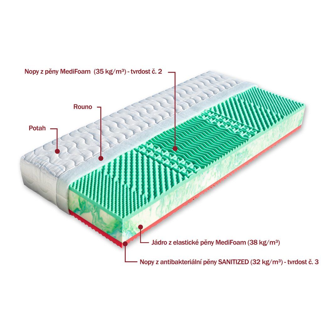 Jádro matrace Ema od českého výrobce Dřevočal je tvořeno pěnou MediFoam (32 kg/m³), která má skvělé podpůrné vlastnosti. Červená ložná plocha je tvořena antibakteriální pěnou tvarovanou do masážních nopů s úpravou Sanitized (32 kg/m³). Jsou vhodné nejen pro alergiky. Jejich druhá strana matrace Ema je tvořena pěnou MediFoam (35 kg/m³), která je taktéž tvarovaná do nopů. Matrace Ema je dostupná ve třech výškách, a to 15, 19 nebo 23 cm. Je vhodná pro všechny typy roštů.Pěna MediFoam - Tato vysoce gramážní pěna, která se vyznačuje skvělými ortopedickými vlastnostmi, je vytvořena speciální technologií. Má dokonalou prodyšnost, pružnost, je tvarově stálá a má dlouhou životnost. Zvýšená pórovitost je velmi dobrá k odvádění tepla z matrace, tato pěna tzv. dýchá. Matrace z pěny MediFoam zajišťují ideální uvolnění páteře, kloubů a svalů po dobu Vašeho spánku. Jsou testované a mají certifikát Textilního zkušebního ústavu, s.p. v Brně. Pěna MediFoam je garancí kvality.Antibakteriální pěna Sanitized® - Speciální antibakteriální pěna s certifikovanou úpravou Sanitized® (biocidní látka- nezávadná, vhodná i pro děti do 3 let), která likviduje baktérie, houby, roztoče, plísně a další nežádoucí mikroorganismy v matraci. Je dermatologicky testována a šetrná vůči pokožce. Matrace z této pěny jsou díky antimikrobiální úpravě Sanitized® jsou revolučním řešením pro alergiky.Vlastnosti potahůÚpletVysoce kvalitní potah prošitý dutým vláknem. Potah je velmi příjemný na dotek, výborně odvádí vlhkost z těla a rychle vysychá. Potah je možno prát na 60°C. Pro snadnější praní a manipulaci je potah dělitelný zipem na dvě části. Tento nejprodávanější potah poskytuje vysoký standard celé matrace. Složení: 100% polyester.AloeVeraKvalitní potah, který obsahuje výtažek známé rostliny Aloe Vera Barbaensis z rodu liliovitých. Má pozitivní vliv na pokožku lidského těla, působí antibakteriálně. Postupně se uvolňující extrakt z AloeVera umožňuje dokonalou relaxaci ve spánku. Potah, prošitý třízónovým způsobem, je příjemný na dotek a standartně vetkané logo zaručuje nezaměnitelnost výrobku. Potah je pratelný na 60°C. Složení: 100% polyester.SilverGuardSilverGuard je jedinečná technologie, která zaručuje trvalou svěžest a hygienu během spánku. Eliminuje bakterie způsobující zápach a chrání před jejich usazováním. Ochrana je trvalá i po častém praní a čištění. Při kontaktu s pokožkou zachovává její přirozenou rovnováhu. Tento potah obsahuje přírodní viskózové vlákno, které ve spojení s moderním designem dodává textilii luxusní charakter. Zaručuje vám absolutní čistotu a pohodlí. SilverGuard® úprava: Využívá stříbro jako jeden z nejstarších a nejznámějších způsobů ochrany před houbami a bakteriemi. Díky působení stříbrných iontů chrání textilii před mikroorganismy a zabraňuje jejich rozvoji přírodní cestou. SilverGuard® zajišťuje konstantní svěžest a hygienu lůžka, vysokou odolnost proti oděru a žmolkování. Potah je pratelný na 60°C. Složení: 35% viskóza, 2% polyamid, 63% polyester.LyocellMateriál z čistého přírodního vlákna získaného ze dřeva technologií šetřící životní prostředí. Se všemi svými vynikajícími charakteristikami Vám poskytuje během spánku optimální pohodlí. K jeho předním vlastnostem patří vysoká absorpční schopnost a velmi rychlé odpařování. Tyto vlastnosti zaručují dokonalý pocit i pro osoby s vyšší potivostí. Mikrovlákna Lenzing Lyocell dodávají látce hedvábný lesk a jsou odolná a necitlivá k mikroorganismům. Potah je možno prát při 60°C. Složení potahu: 44% lyocell, 33% polyamid, 23% polyester.MedicottZnačkový typ pleteného potahu, který svým speciálním složením zabraňuje tvorbě a usazování domácích roztočů a tvorbu plísní. Roztoči žijí v tmavém, vlhkém a málo odvětrávaném prostředí, a tomu přesně odpovídá vaše postel. Hlavní obživou pro roztoče jsou odpadávající buňky vaší kůže. Ty jsou rozkládány plísněmi a tak se stávají stravitelnými pro prachové roztoče. Plíseň samotná způsobuje alergie spojené s dýchacími symptomy. Medicott je účinná složka látky, která zabraňuje v bavlně nebo v látkách s bavlněným základem vzniku plísní a současně přežití prachových roztočů. Medicott má vynikající antibakteriální účinky, které jsou dosaženy bez přídavku chemických látek. Tajemství úspěšného fungování spočívá v odstranění nečistot z vláken přírodní bavlny, čímž se zamezí potencionálnímu domovu plísní. Potah má dlouhotrvající účinek při pravidelné údržbě. Potah je pratelný na 60°C. Složení: 40% bavlna, 35% polyamid, 25% polyester.LevanduleVelmi příjemná luxusní látka, která obsahuje výtažky levandule lékařské. Levandule je oblíbená léčivá bylinka s charakteristickou vůní, známá pro svoje protizánětlivé, antiseptické a repelentní účinky. Pomáhá proti stresu, depresím, snižuje krevní tlak a potlačuje růst baktérií. Její zklidňující účinky jsou známé už z dávných dob, pozitivně ovlivňují kvalitu spánku, působí proti nespavosti a nervozitě. Levandule pomůže zmírnit svalové napětí a podpořit přirozenou regeneraci organismu. Jemná esence z levandule je skvělým pomocníkem pro hluboký a kvalitní spánek. Potah Lavandule patří mezi nejkvalitnější a nejoblíbenější potahy na trhu a zajistí Vašemu lůžku maximální komfort a hygienu. Potah je pratelný na 60°C. Složení potahu: 30,59% tencel, 69,41% polyester.Doplňkové parametry