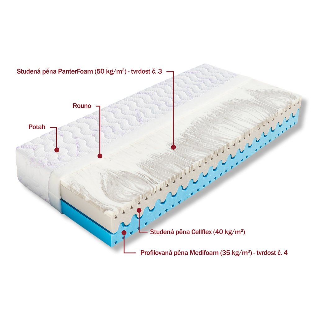 Pevnější matrace Helena od českého výrobce Dřevočal se špičkovou studenou pěnou Cellflex, která je díky vysoké hustotě (40 kg/m3) velmi odolná a zaručí dlouhou životnost Vaší matrace. Její zářezy v exponovaných místech přispívají k dokonalé opoře ležícího těla (pod rameny a boky se více prohne a odpruží). Pěna Cellflex je doplněna poddajnější studenou pěnou PanterFoam, která je velmi vzdušná a elastická, proto tvoří měkčí stranu matrace Helena (tvrdost č. 3). Naproti tomu pevnější strana matrace Helena (tvrdost č. 4) je tvořena vysoce gramážní pěnou MediFoam, která i při vyšší hustotě optimalizuje rozložení tlaku na matraci. I na jejím povrchu najdete speciální zářezy. Jádro matrace je provzdušněné vlnkovitým prořezem důležitým pro větší prodyšnost matrace a dokonalou spolupráci obou pěn. Celková výška matrace Helena je cca 25 cm.Cellflex - Tato špičková studená HR pěna je tou pravou oporou Vašeho těla. Díky své vysoké hustotě (40 kg/m3) je velmi odolná a zaručí dlouhou životnost Vaší matrace. V exponovaných místech (ramena a boky) ji při výrobě profilujeme ergonomicky navrženými zářezy, které přispívají k dokonalé opoře ležícího těla. Oceníte i její dokonalou prodyšnost. Reguluje obsah vlhkosti a tepla v matraci, takže se nebudete zbytečně přehřívat. Je pružná a díky své vysoké hustotě velmi odolná a kvalitní. V kombinaci se studenou pěnou PanterFoam tvoří dokonalou dvojici pro nové, vysoce odolné matrace.PanterFoam - jedinečná pěna, která přináší to nejlepší pro Váš spánek. Odolná studená HR pěna je velmi pohodlná a její vlastnosti jsou stálé i po mnoha letech užívání. Její vysoká hustota (50 kg/m3) zaručí nadstandardní odolnost. Je pro ni charakteristická mramorovaná kresba, díky které ji ihned poznáte. Vzhledem k otevřené buněčné struktuře je vzdušná a dokáže udržet v matraci tzv. suché klima eliminující mikroorganismy, což ocení nejen alergici. Tato struktura rovněž snižuje počet tlakových bodů na těle. Díky tomu tento materiál předchází vzniku proleženin tzv. dekubitů. Proto je ve světě volbou číslo jedna pro medicínské aplikace.Vlastnosti potahůÚpletVysoce kvalitní potah prošitý dutým vláknem. Potah je velmi příjemný na dotek, výborně odvádí vlhkost z těla a rychle vysychá. Potah je možno prát na 60°C. Pro snadnější praní a manipulaci je potah dělitelný zipem na dvě části. Tento nejprodávanější potah poskytuje vysoký standard celé matrace. Složení: 100% polyester.AloeVeraKvalitní potah, který obsahuje výtažek známé rostliny Aloe Vera Barbaensis z rodu liliovitých. Má pozitivní vliv na pokožku lidského těla, působí antibakteriálně. Postupně se uvolňující extrakt z AloeVera umožňuje dokonalou relaxaci ve spánku. Potah, prošitý třízónovým způsobem, je příjemný na dotek a standartně vetkané logo zaručuje nezaměnitelnost výrobku. Potah je pratelný na 60°C. Složení: 100% polyester.SilverGuardSilverGuard je jedinečná technologie, která zaručuje trvalou svěžest a hygienu během spánku. Eliminuje bakterie způsobující zápach a chrání před jejich usazováním. Ochrana je trvalá i po častém praní a čištění. Při kontaktu s pokožkou zachovává její přirozenou rovnováhu. Tento potah obsahuje přírodní viskózové vlákno, které ve spojení s moderním designem dodává textilii luxusní charakter. Zaručuje vám absolutní čistotu a pohodlí. SilverGuard® úprava: Využívá stříbro jako jeden z nejstarších a nejznámějších způsobů ochrany před houbami a bakteriemi. Díky působení stříbrných iontů chrání textilii před mikroorganismy a zabraňuje jejich rozvoji přírodní cestou. SilverGuard® zajišťuje konstantní svěžest a hygienu lůžka, vysokou odolnost proti oděru a žmolkování. Potah je pratelný na 60°C. Složení: 35% viskóza, 2% polyamid, 63% polyester.LyocellMateriál z čistého přírodního vlákna získaného ze dřeva technologií šetřící životní prostředí. Se všemi svými vynikajícími charakteristikami Vám poskytuje během spánku optimální pohodlí. K jeho předním vlastnostem patří vysoká absorpční schopnost a velmi rychlé odpařování. Tyto vlastnosti zaručují dokonalý pocit i pro osoby s vyšší potivostí. Mikrovlákna Lenzing Lyocell dodávají látce hedvábný lesk a jsou odolná a necitlivá k mikroorganismům. Potah je možno prát při 60°C. Složení potahu: 44% lyocell, 33% polyamid, 23% polyester.MedicottZnačkový typ pleteného potahu, který svým speciálním složením zabraňuje tvorbě a usazování domácích roztočů a tvorbu plísní. Roztoči žijí v tmavém, vlhkém a málo odvětrávaném prostředí, a tomu přesně odpovídá vaše postel. Hlavní obživou pro roztoče jsou odpadávající buňky vaší kůže. Ty jsou rozkládány plísněmi a tak se stávají stravitelnými pro prachové roztoče. Plíseň samotná způsobuje alergie spojené s dýchacími symptomy. Medicott je účinná složka látky, která zabraňuje v bavlně nebo v látkách s bavlněným základem vzniku plísní a současně přežití prachových roztočů. Medicott má vynikající antibakteriální účinky, které jsou dosaženy bez přídavku chemických látek. Tajemství úspěšného fungování spočívá v odstranění nečistot z vláken přírodní bavlny, čímž se zamezí potencionálnímu domovu plísní. Potah má dlouhotrvající účinek při pravidelné údržbě. Potah je pratelný na 60°C. Složení: 40% bavlna, 35% polyamid, 25% polyester.LevanduleVelmi příjemná luxusní látka, která obsahuje výtažky levandule lékařské. Levandule je oblíbená léčivá bylinka s charakteristickou vůní, známá pro svoje protizánětlivé, antiseptické a repelentní úči