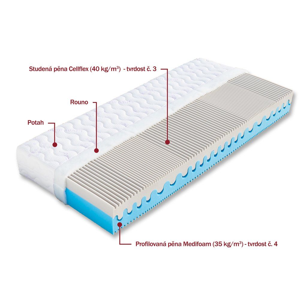 Pevná ortopedická matrace Hermina od českého výrobce Dřevočal s volbou dvojí tvrdosti, která Vás nadchne špičkovou kvalitou nizozemských pěn. Její provzdušněný střed se díky různě širokým vlnkám výborně přizpůsobí ležícímu tělu. Měkčí strana matrace Hermina – to je luxusní studená pěna značky Cellflex, která je díky svým otevřeným buňkám prodyšná a zajistí vynikající rozložení tlaku na matraci. Díky vysoké hustotě (40 kg/m3) je velmi odolná a příjemná. Pevnější strana matrace Hermina je tvořena tvrzenou pěnou MediFoam. Obě pěny jsou na povrchu příčně profilované do malinkých vlnek pro větší vzdušnost a lepší rozložení váhy těla. Pěny mají vysokou gramáž, proto je matrace vhodná i pro vyšší zatížení – do 140 kg. Celková výška matrace Hermina je cca 22 cm.Cellflex - Tato špičková studená HR pěna je tou pravou oporou Vašeho těla. Díky své vysoké hustotě (40 kg/m3) je velmi odolná a zaručí dlouhou životnost Vaší matrace. V exponovaných místech (ramena a boky) ji při výrobě profilujeme ergonomicky navrženými zářezy, které přispívají k dokonalé opoře ležícího těla. Oceníte i její dokonalou prodyšnost. Reguluje obsah vlhkosti a tepla v matraci, takže se nebudete zbytečně přehřívat. Je pružná a díky své vysoké hustotě velmi odolná a kvalitní. V kombinaci se studenou pěnou PanterFoam tvoří dokonalou dvojici pro nové, vysoce odolné matrace.Vlastnosti potahůÚpletVysoce kvalitní potah prošitý dutým vláknem. Potah je velmi příjemný na dotek, výborně odvádí vlhkost z těla a rychle vysychá. Potah je možno prát na 60°C. Pro snadnější praní a manipulaci je potah dělitelný zipem na dvě části. Tento nejprodávanější potah poskytuje vysoký standard celé matrace. Složení: 100% polyester.AloeVeraKvalitní potah, který obsahuje výtažek známé rostliny Aloe Vera Barbaensis z rodu liliovitých. Má pozitivní vliv na pokožku lidského těla, působí antibakteriálně. Postupně se uvolňující extrakt z AloeVera umožňuje dokonalou relaxaci ve spánku. Potah, prošitý třízónovým způsobem, je příjemný na dotek a standartně vetkané logo zaručuje nezaměnitelnost výrobku. Potah je pratelný na 60°C. Složení: 100% polyester.SilverGuardSilverGuard je jedinečná technologie, která zaručuje trvalou svěžest a hygienu během spánku. Eliminuje bakterie způsobující zápach a chrání před jejich usazováním. Ochrana je trvalá i po častém praní a čištění. Při kontaktu s pokožkou zachovává její přirozenou rovnováhu. Tento potah obsahuje přírodní viskózové vlákno, které ve spojení s moderním designem dodává textilii luxusní charakter. Zaručuje vám absolutní čistotu a pohodlí. SilverGuard® úprava: Využívá stříbro jako jeden z nejstarších a nejznámějších způsobů ochrany před houbami a bakteriemi. Díky působení stříbrných iontů chrání textilii před mikroorganismy a zabraňuje jejich rozvoji přírodní cestou. SilverGuard® zajišťuje konstantní svěžest a hygienu lůžka, vysokou odolnost proti oděru a žmolkování. Potah je pratelný na 60°C. Složení: 35% viskóza, 2% polyamid, 63% polyester.LyocellMateriál z čistého přírodního vlákna získaného ze dřeva technologií šetřící životní prostředí. Se všemi svými vynikajícími charakteristikami Vám poskytuje během spánku optimální pohodlí. K jeho předním vlastnostem patří vysoká absorpční schopnost a velmi rychlé odpařování. Tyto vlastnosti zaručují dokonalý pocit i pro osoby s vyšší potivostí. Mikrovlákna Lenzing Lyocell dodávají látce hedvábný lesk a jsou odolná a necitlivá k mikroorganismům. Potah je možno prát při 60°C. Složení potahu: 44% lyocell, 33% polyamid, 23% polyester.MedicottZnačkový typ pleteného potahu, který svým speciálním složením zabraňuje tvorbě a usazování domácích roztočů a tvorbu plísní. Roztoči žijí v tmavém, vlhkém a málo odvětrávaném prostředí, a tomu přesně odpovídá vaše postel. Hlavní obživou pro roztoče jsou odpadávající buňky vaší kůže. Ty jsou rozkládány plísněmi a tak se stávají stravitelnými pro prachové roztoče. Plíseň samotná způsobuje alergie spojené s dýchacími symptomy. Medicott je účinná složka látky, která zabraňuje v bavlně nebo v látkách s bavlněným základem vzniku plísní a současně přežití prachových roztočů. Medicott má vynikající antibakteriální účinky, které jsou dosaženy bez přídavku chemických látek. Tajemství úspěšného fungování spočívá v odstranění nečistot z vláken přírodní bavlny, čímž se zamezí potencionálnímu domovu plísní. Potah má dlouhotrvající účinek při pravidelné údržbě. Potah je pratelný na 60°C. Složení: 40% bavlna, 35% polyamid, 25% polyester.LevanduleVelmi příjemná luxusní látka, která obsahuje výtažky levandule lékařské. Levandule je oblíbená léčivá bylinka s charakteristickou vůní, známá pro svoje protizánětlivé, antiseptické a repelentní účinky. Pomáhá proti stresu, depresím, snižuje krevní tlak a potlačuje růst baktérií. Její zklidňující účinky jsou známé už z dávných dob, pozitivně ovlivňují kvalitu spánku, působí proti nespavosti a nervozitě. Levandule pomůže zmírnit svalové napětí a podpořit přirozenou regeneraci organismu. Jemná esence z levandule je skvělým pomocníkem pro hluboký a kvalitní spánek. Potah Lavandule patří mezi nejkvalitnější a nejoblíbenější potahy na trhu a zajistí Vašemu lůžku maximální komfort a hygienu. Potah je pratelný na 60°C. Složení potahu: 30,59% tencel, 69,41% polyester.Doplňkové parametry