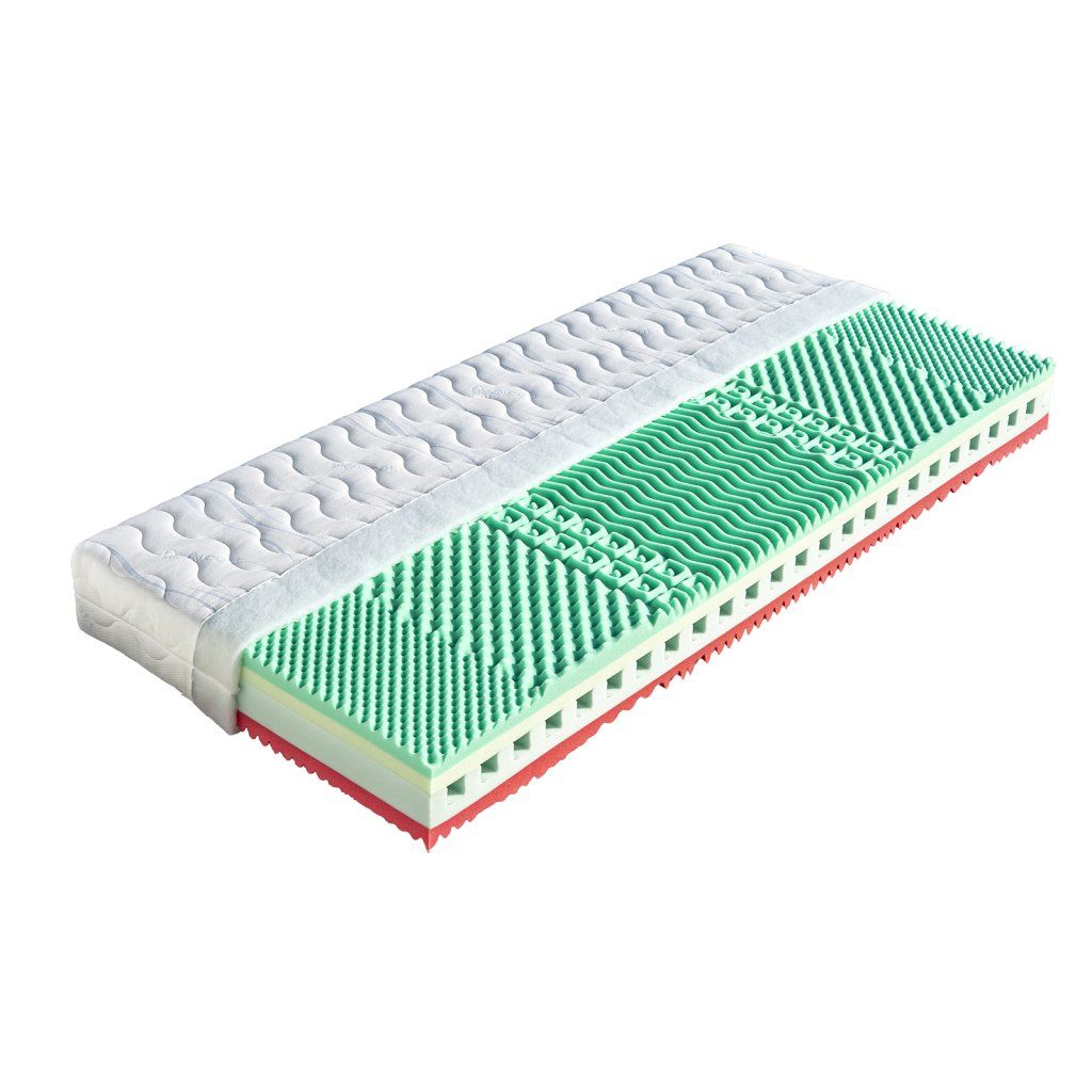 Jádro této matrace tvoří elastická pěna s příčnými otvory, které zaručují dokonalou vzdušnost. Žlutozelená antibakteriální pěna zabraňuje tvorbě bakterií a výskytu roztočů. Tato strana je označena štítkem v potahu. Zelená elastická pěna je tvarovaná do masážních nopů v 7 zónách. Matrace je vhodná pro alergiky. Může být položena na všechny typy roštů i na pevný podklad.Vlastnosti potahůÚpletVysoce kvalitní potah prošitý dutým vláknem. Potah je velmi příjemný na dotek, výborně odvádí vlhkost z těla a rychle vysychá. Potah je možno prát na 60°C. Pro snadnější praní a manipulaci je potah dělitelný zipem na dvě části. Tento nejprodávanější potah poskytuje vysoký standard celé matrace. Složení: 100% polyester.AloeVeraKvalitní potah, který obsahuje výtažek známé rostliny Aloe Vera Barbaensis z rodu liliovitých. Má pozitivní vliv na pokožku lidského těla, působí antibakteriálně. Postupně se uvolňující extrakt z AloeVera umožňuje dokonalou relaxaci ve spánku. Potah, prošitý třízónovým způsobem, je příjemný na dotek a standartně vetkané logo zaručuje nezaměnitelnost výrobku. Potah je pratelný na 60°C. Složení: 100% polyester.SilverGuardSilverGuard je jedinečná technologie, která zaručuje trvalou svěžest a hygienu během spánku. Eliminuje bakterie způsobující zápach a chrání před jejich usazováním. Ochrana je trvalá i po častém praní a čištění. Při kontaktu s pokožkou zachovává její přirozenou rovnováhu. Tento potah obsahuje přírodní viskózové vlákno, které ve spojení s moderním designem dodává textilii luxusní charakter. Zaručuje vám absolutní čistotu a pohodlí. SilverGuard® úprava: Využívá stříbro jako jeden z nejstarších a nejznámějších způsobů ochrany před houbami a bakteriemi. Díky působení stříbrných iontů chrání textilii před mikroorganismy a zabraňuje jejich rozvoji přírodní cestou. SilverGuard® zajišťuje konstantní svěžest a hygienu lůžka, vysokou odolnost proti oděru a žmolkování. Potah je pratelný na 60°C. Složení: 35% viskóza, 2% polyamid, 63% polyester.LyocellMateriál z čistého přírodního vlákna získaného ze dřeva technologií šetřící životní prostředí. Se všemi svými vynikajícími charakteristikami Vám poskytuje během spánku optimální pohodlí. K jeho předním vlastnostem patří vysoká absorpční schopnost a velmi rychlé odpařování. Tyto vlastnosti zaručují dokonalý pocit i pro osoby s vyšší potivostí. Mikrovlákna Lenzing Lyocell dodávají látce hedvábný lesk a jsou odolná a necitlivá k mikroorganismům. Potah je možno prát při 60°C. Složení potahu: 44% lyocell, 33% polyamid, 23% polyester.MedicottZnačkový typ pleteného potahu, který svým speciálním složením zabraňuje tvorbě a usazování domácích roztočů a tvorbu plísní. Roztoči žijí v tmavém, vlhkém a málo odvětrávaném prostředí, a tomu přesně odpovídá vaše postel. Hlavní obživou pro roztoče jsou odpadávající buňky vaší kůže. Ty jsou rozkládány plísněmi a tak se stávají stravitelnými pro prachové roztoče. Plíseň samotná způsobuje alergie spojené s dýchacími symptomy. Medicott je účinná složka látky, která zabraňuje v bavlně nebo v látkách s bavlněným základem vzniku plísní a současně přežití prachových roztočů. Medicott má vynikající antibakteriální účinky, které jsou dosaženy bez přídavku chemických látek. Tajemství úspěšného fungování spočívá v odstranění nečistot z vláken přírodní bavlny, čímž se zamezí potencionálnímu domovu plísní. Potah má dlouhotrvající účinek při pravidelné údržbě. Potah je pratelný na 60°C. Složení: 40% bavlna, 35% polyamid, 25% polyester.Doplňkové parametry