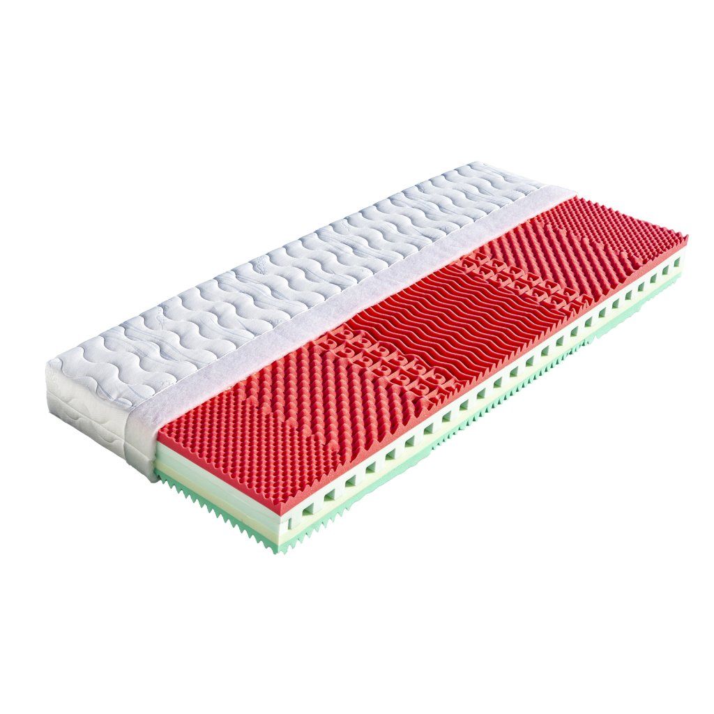 Jádro této matrace tvoří elastická pěna s příčnými otvory, které zaručují dokonalou vzdušnost. Žlutozelená antibakteriální pěna zabraňuje tvorbě bakterií a výskytu roztočů. Tato strana je označena štítkem v potahu. Zelená elastická pěna je tvarovaná do masážních nopů v 7 zónách. Matrace je vhodná pro alergiky. Může být položena na všechny typy roštů i na pevný podklad.Vlastnosti potahůÚpletVysoce kvalitní potah prošitý dutým vláknem. Potah je velmi příjemný na dotek, výborně odvádí vlhkost z těla a rychle vysychá. Potah je možno prát na 60°C. Pro snadnější praní a manipulaci je potah dělitelný zipem na dvě části. Tento nejprodávanější potah poskytuje vysoký standard celé matrace. Složení: 100% polyester.AloeVeraKvalitní potah, který obsahuje výtažek známé rostliny Aloe Vera Barbaensis z rodu liliovitých. Má pozitivní vliv na pokožku lidského těla, působí antibakteriálně. Postupně se uvolňující extrakt z AloeVera umožňuje dokonalou relaxaci ve spánku. Potah, prošitý třízónovým způsobem, je příjemný na dotek a standartně vetkané logo zaručuje nezaměnitelnost výrobku. Potah je pratelný na 60°C. Složení: 100% polyester.SilverGuardSilverGuard je jedinečná technologie, která zaručuje trvalou svěžest a hygienu během spánku. Eliminuje bakterie způsobující zápach a chrání před jejich usazováním. Ochrana je trvalá i po častém praní a čištění. Při kontaktu s pokožkou zachovává její přirozenou rovnováhu. Tento potah obsahuje přírodní viskózové vlákno, které ve spojení s moderním designem dodává textilii luxusní charakter. Zaručuje vám absolutní čistotu a pohodlí. SilverGuard® úprava: Využívá stříbro jako jeden z nejstarších a nejznámějších způsobů ochrany před houbami a bakteriemi. Díky působení stříbrných iontů chrání textilii před mikroorganismy a zabraňuje jejich rozvoji přírodní cestou. SilverGuard® zajišťuje konstantní svěžest a hygienu lůžka, vysokou odolnost proti oděru a žmolkování. Potah je pratelný na 60°C. Složení: 35% viskóza, 2% polyamid, 63% polyester.LyocellMateriál z čistého přírodního vlákna získaného ze dřeva technologií šetřící životní prostředí. Se všemi svými vynikajícími charakteristikami Vám poskytuje během spánku optimální pohodlí. K jeho předním vlastnostem patří vysoká absorpční schopnost a velmi rychlé odpařování. Tyto vlastnosti zaručují dokonalý pocit i pro osoby s vyšší potivostí. Mikrovlákna Lenzing Lyocell dodávají látce hedvábný lesk a jsou odolná a necitlivá k mikroorganismům. Potah je možno prát při 60°C. Složení potahu: 44% lyocell, 33% polyamid, 23% polyester.MedicottZnačkový typ pleteného potahu, který svým speciálním složením zabraňuje tvorbě a usazování domácích roztočů a tvorbu plísní. Roztoči žijí v tmavém, vlhkém a málo odvětrávaném prostředí, a tomu přesně odpovídá vaše postel. Hlavní obživou pro roztoče jsou odpadávající buňky vaší kůže. Ty jsou rozkládány plísněmi a tak se stávají stravitelnými pro prachové roztoče. Plíseň samotná způsobuje alergie spojené s dýchacími symptomy. Medicott je účinná složka látky, která zabraňuje v bavlně nebo v látkách s bavlněným základem vzniku plísní a současně přežití prachových roztočů. Medicott má vynikající antibakteriální účinky, které jsou dosaženy bez přídavku chemických látek. Tajemství úspěšného fungování spočívá v odstranění nečistot z vláken přírodní bavlny, čímž se zamezí potencionálnímu domovu plísní. Potah má dlouhotrvající účinek při pravidelné údržbě. Potah je pratelný na 60°C. Složení: 40% bavlna, 35% polyamid, 25% polyester.Doplňkové parametry