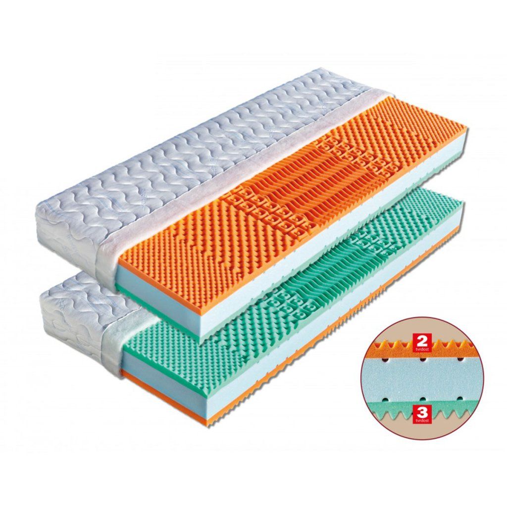 Kvalitní sedmizónová matrace, jejíž nosné vrstvy tvoří kombinace studené a oblíbené viscoelastické pěny. Oranžová nosná vrstva tvarovaná do masážních nopů je tvořena z viscoelastické pěny obohacené o sójový extrakt. Použitím této pěny se snižuje protitlak matrace na ležící tělo. Zelená nosná vrstva tvarovaná do masážních nopů je tvořena z kvalitní studené pěny s přídavkem Aloe vera, které má příznivý vliv na pokožku. Jádro matrace tvoří studená pěna, která je provzdušněna otvory zaručujícími ventilaci a změkčení matrace v oblasti ramen.Vlastnosti potahůÚpletVysoce kvalitní potah prošitý dutým vláknem. Potah je velmi příjemný na dotek, výborně odvádí vlhkost z těla a rychle vysychá. Potah je možno prát na 60°C. Pro snadnější praní a manipulaci je potah dělitelný zipem na dvě části. Tento nejprodávanější potah poskytuje vysoký standard celé matrace. Složení: 100% polyester.AloeVeraKvalitní potah, který obsahuje výtažek známé rostliny Aloe Vera Barbaensis z rodu liliovitých. Má pozitivní vliv na pokožku lidského těla, působí antibakteriálně. Postupně se uvolňující extrakt z AloeVera umožňuje dokonalou relaxaci ve spánku. Potah, prošitý třízónovým způsobem, je příjemný na dotek a standartně vetkané logo zaručuje nezaměnitelnost výrobku. Potah je pratelný na 60°C. Složení: 100% polyester.SilverGuardSilverGuard je jedinečná technologie, která zaručuje trvalou svěžest a hygienu během spánku. Eliminuje bakterie způsobující zápach a chrání před jejich usazováním. Ochrana je trvalá i po častém praní a čištění. Při kontaktu s pokožkou zachovává její přirozenou rovnováhu. Tento potah obsahuje přírodní viskózové vlákno, které ve spojení s moderním designem dodává textilii luxusní charakter. Zaručuje vám absolutní čistotu a pohodlí. SilverGuard® úprava: Využívá stříbro jako jeden z nejstarších a nejznámějších způsobů ochrany před houbami a bakteriemi. Díky působení stříbrných iontů chrání textilii před mikroorganismy a zabraňuje jejich rozvoji přírodní cestou. SilverGuard® zajišťuje konstantní svěžest a hygienu lůžka, vysokou odolnost proti oděru a žmolkování. Potah je pratelný na 60°C. Složení: 35% viskóza, 2% polyamid, 63% polyester.LyocellMateriál z čistého přírodního vlákna získaného ze dřeva technologií šetřící životní prostředí. Se všemi svými vynikajícími charakteristikami Vám poskytuje během spánku optimální pohodlí. K jeho předním vlastnostem patří vysoká absorpční schopnost a velmi rychlé odpařování. Tyto vlastnosti zaručují dokonalý pocit i pro osoby s vyšší potivostí. Mikrovlákna Lenzing Lyocell dodávají látce hedvábný lesk a jsou odolná a necitlivá k mikroorganismům. Potah je možno prát při 60°C. Složení potahu: 44% lyocell, 33% polyamid, 23% polyester.MedicottZnačkový typ pleteného potahu, který svým speciálním složením zabraňuje tvorbě a usazování domácích roztočů a tvorbu plísní. Roztoči žijí v tmavém, vlhkém a málo odvětrávaném prostředí, a tomu přesně odpovídá vaše postel. Hlavní obživou pro roztoče jsou odpadávající buňky vaší kůže. Ty jsou rozkládány plísněmi a tak se stávají stravitelnými pro prachové roztoče. Plíseň samotná způsobuje alergie spojené s dýchacími symptomy. Medicott je účinná složka látky, která zabraňuje v bavlně nebo v látkách s bavlněným základem vzniku plísní a současně přežití prachových roztočů. Medicott má vynikající antibakteriální účinky, které jsou dosaženy bez přídavku chemických látek. Tajemství úspěšného fungování spočívá v odstranění nečistot z vláken přírodní bavlny, čímž se zamezí potencionálnímu domovu plísní. Potah má dlouhotrvající účinek při pravidelné údržbě. Potah je pratelný na 60°C. Složení: 40% bavlna, 35% polyamid, 25% polyester.Doplňkové parametry