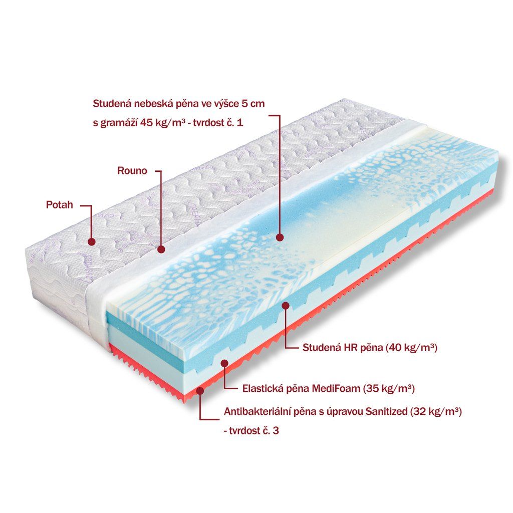 Matrace Natálie vyniká jedinečnými vlastnostmi velmi poddajné studené pěny ve výšce 5 cm s gramáží 45 kg/m³. Tato speciální tzv. nebeská pěna s příjemným povrchem je krásně měkká, velmi pohodlná a nevytváří protitlak vůči tělu. Na této nebeské pěně budete spát jako na obláčku. Provzdušněné jádro matrace Natálie s příčnými průduchy je složené z vrstvy extra prodyšné studené HR pěny (40 kg/m³) s dokonalou elasticitou a z tvrzené elastické pěny MediFoam (35 kg/m³). Druhou vrchní vrstvu tvarovanou do masážních nopů tvoří oblíbená antibakteriální pěna s úpravou Sanitized (32 kg/m³), která poskytuje trvalou ochranu proti bakteriím, roztočům a plísním. Matrace je vhodná pro alergiky a může být uložena na všechny typy roštů. Celková výška matrace Natálie je cca 25 cm.Vlastnosti potahůÚpletVysoce kvalitní potah prošitý dutým vláknem. Potah je velmi příjemný na dotek, výborně odvádí vlhkost z těla a rychle vysychá. Potah je možno prát na 60°C. Pro snadnější praní a manipulaci je potah dělitelný zipem na dvě části. Tento nejprodávanější potah poskytuje vysoký standard celé matrace. Složení: 100% polyester.AloeVeraKvalitní potah, který obsahuje výtažek známé rostliny Aloe Vera Barbaensis z rodu liliovitých. Má pozitivní vliv na pokožku lidského těla, působí antibakteriálně. Postupně se uvolňující extrakt z AloeVera umožňuje dokonalou relaxaci ve spánku. Potah, prošitý třízónovým způsobem, je příjemný na dotek a standartně vetkané logo zaručuje nezaměnitelnost výrobku. Potah je pratelný na 60°C. Složení: 100% polyester.SilverGuardSilverGuard je jedinečná technologie, která zaručuje trvalou svěžest a hygienu během spánku. Eliminuje bakterie způsobující zápach a chrání před jejich usazováním. Ochrana je trvalá i po častém praní a čištění. Při kontaktu s pokožkou zachovává její přirozenou rovnováhu. Tento potah obsahuje přírodní viskózové vlákno, které ve spojení s moderním designem dodává textilii luxusní charakter. Zaručuje vám absolutní čistotu a pohodlí. SilverGuard® úprava: Využívá stříbro jako jeden z nejstarších a nejznámějších způsobů ochrany před houbami a bakteriemi. Díky působení stříbrných iontů chrání textilii před mikroorganismy a zabraňuje jejich rozvoji přírodní cestou. SilverGuard® zajišťuje konstantní svěžest a hygienu lůžka, vysokou odolnost proti oděru a žmolkování. Potah je pratelný na 60°C. Složení: 35% viskóza, 2% polyamid, 63% polyester.LyocellMateriál z čistého přírodního vlákna získaného ze dřeva technologií šetřící životní prostředí. Se všemi svými vynikajícími charakteristikami Vám poskytuje během spánku optimální pohodlí. K jeho předním vlastnostem patří vysoká absorpční schopnost a velmi rychlé odpařování. Tyto vlastnosti zaručují dokonalý pocit i pro osoby s vyšší potivostí. Mikrovlákna Lenzing Lyocell dodávají látce hedvábný lesk a jsou odolná a necitlivá k mikroorganismům. Potah je možno prát při 60°C. Složení potahu: 44% lyocell, 33% polyamid, 23% polyester.MedicottZnačkový typ pleteného potahu, který svým speciálním složením zabraňuje tvorbě a usazování domácích roztočů a tvorbu plísní. Roztoči žijí v tmavém, vlhkém a málo odvětrávaném prostředí, a tomu přesně odpovídá vaše postel. Hlavní obživou pro roztoče jsou odpadávající buňky vaší kůže. Ty jsou rozkládány plísněmi a tak se stávají stravitelnými pro prachové roztoče. Plíseň samotná způsobuje alergie spojené s dýchacími symptomy. Medicott je účinná složka látky, která zabraňuje v bavlně nebo v látkách s bavlněným základem vzniku plísní a současně přežití prachových roztočů. Medicott má vynikající antibakteriální účinky, které jsou dosaženy bez přídavku chemických látek. Tajemství úspěšného fungování spočívá v odstranění nečistot z vláken přírodní bavlny, čímž se zamezí potencionálnímu domovu plísní. Potah má dlouhotrvající účinek při pravidelné údržbě. Potah je pratelný na 60°C. Složení: 40% bavlna, 35% polyamid, 25% polyester.LevanduleVelmi příjemná luxusní látka, která obsahuje výtažky levandule lékařské. Levandule je oblíbená léčivá bylinka s charakteristickou vůní, známá pro svoje protizánětlivé, antiseptické a repelentní účinky. Pomáhá proti stresu, depresím, snižuje krevní tlak a potlačuje růst baktérií. Její zklidňující účinky jsou známé už z dávných dob, pozitivně ovlivňují kvalitu spánku, působí proti nespavosti a nervozitě. Levandule pomůže zmírnit svalové napětí a podpořit přirozenou regeneraci organismu. Jemná esence z levandule je skvělým pomocníkem pro hluboký a kvalitní spánek. Potah Lavandule patří mezi nejkvalitnější a nejoblíbenější potahy na trhu a zajistí Vašemu lůžku maximální komfort a hygienu. Potah je pratelný na 60°C. Složení potahu: 30,59% tencel, 69,41% polyester.Doplňkové parametry