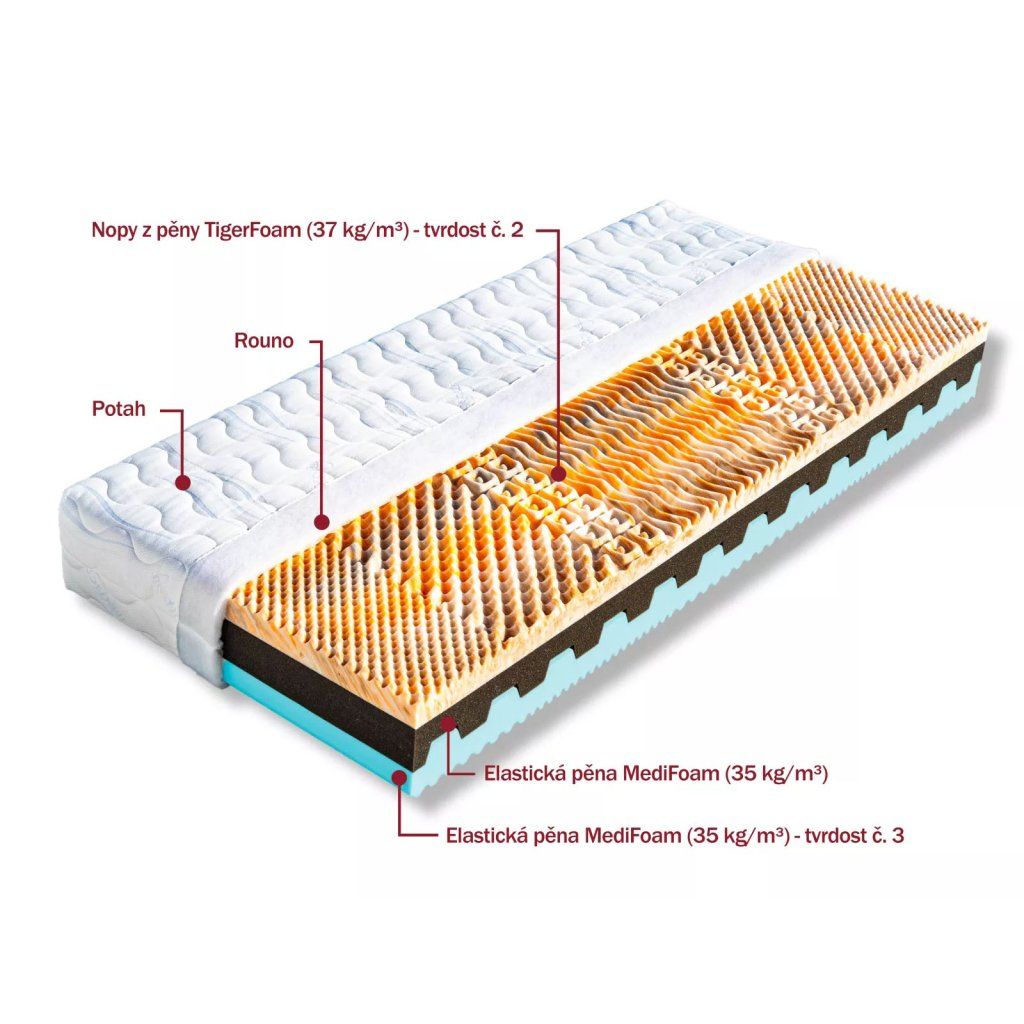 Luxusní matrace Nina od tradičního českého výrobce Dřevočal s volbou dvojí tvrdosti Vám umožňuje vybrat si tuhost dle Vaší preference. Měkčí stranu tvoří komfortní studená pěna TigerFoam (37 kg/m³) tvarovaná do nopů v sedmi zónách. Tento špičkový materiál je výjimečný svou schopností přesně kopírovat obrysy těla a zajistit vynikající cirkulaci vzduchu. Díky struktuře otevřených pórů účinně reguluje obsah vlhkosti a tepla v matraci. Střed jádra matrace Nina je provzdušněn příčnými průduchy, které zaručují změkčení matrace v exponovaných místech. Je složeno ze dvou značkových pěn MediFoam (35 kg/m³) a jeho spodní část je profilována do jemných masážních vlnek. Tato ortopedická matrace je vhodná pro všechny typy roštů. Celková výška matrace Nina je cca 21 cm.TigerFoam – Prémiová studená pěna pro maximální komfortTigerFoam je inovativní studená pěna navržená pro maximální pohodlí a dlouhou životnost. Díky své otevřené buněčné struktuře poskytuje vynikající prodyšnost, což zajišťuje efektivní odvod vlhkosti a tepla během spánku. Tato vlastnost přispívá k vytvoření hygienického a příjemného prostředí pro odpočinek.Klíčové vlastnosti TigerFoam:Vysoký komfort: Pěna se přizpůsobuje tvaru těla, poskytuje optimální podporu a zvyšuje kvalitu spánku.Prodyšnost: Otevřená buněčná struktura umožňuje efektivní ventilaci a odvod vlhkosti, což přispívá k hygieně a pohodlí.Odolnost: TigerFoam je vysoce odolná vůči deformacím, což zajišťuje dlouhou životnost matrací a čalouněného nábytku.Pružnost: Pěna se snadno přizpůsobuje tvaru těla, což zajišťuje optimální podporu a pohodlí.Použita je TigerFoam s gramáží 37 kg/m³, která se vyznačuje ideální kombinací hustoty a tvrdosti pro dosažení maximálního komfortu a podpory. Testy provedené nezávislou laboratoří Fira® prokázaly, že TigerFoam je vysoce odolná vůči opotřebení, přičemž si zachovává své hlavní vlastnosti i po 80 000 stlačeních. Dále splňuje nehořlavé požadavky Kalifornského testu a je certifikována podle standardu Oeko-Tex Standard 100, třída 1, což potvrzuje její zdravotní nezávadnost. Díky těmto vlastnostem je TigerFoam ideální volbou pro ty, kteří hledají materiál kombinující luxusní komfort s dlouhou životností a hygienickými výhodami.Vlastnosti potahůÚpletVysoce kvalitní potah prošitý dutým vláknem. Potah je velmi příjemný na dotek, výborně odvádí vlhkost z těla a rychle vysychá. Potah je možno prát na 60°C. Pro snadnější praní a manipulaci je potah dělitelný zipem na dvě části. Tento nejprodávanější potah poskytuje vysoký standard celé matrace. Složení: 100% polyester.AloeVeraKvalitní potah, který obsahuje výtažek známé rostliny Aloe Vera Barbaensis z rodu liliovitých. Má pozitivní vliv na pokožku lidského těla, působí antibakteriálně. Postupně se uvolňující extrakt z AloeVera umožňuje dokonalou relaxaci ve spánku. Potah, prošitý třízónovým způsobem, je příjemný na dotek a standartně vetkané logo zaručuje nezaměnitelnost výrobku. Potah je pratelný na 60°C. Složení: 100% polyester.SilverGuardSilverGuard je jedinečná technologie, která zaručuje trvalou svěžest a hygienu během spánku. Eliminuje bakterie způsobující zápach a chrání před jejich usazováním. Ochrana je trvalá i po častém praní a čištění. Při kontaktu s pokožkou zachovává její přirozenou rovnováhu. Tento potah obsahuje přírodní viskózové vlákno, které ve spojení s moderním designem dodává textilii luxusní charakter. Zaručuje vám absolutní čistotu a pohodlí. SilverGuard® úprava: Využívá stříbro jako jeden z nejstarších a nejznámějších způsobů ochrany před houbami a bakteriemi. Díky působení stříbrných iontů chrání textilii před mikroorganismy a zabraňuje jejich rozvoji přírodní cestou. SilverGuard® zajišťuje konstantní svěžest a hygienu lůžka, vysokou odolnost proti oděru a žmolkování. Potah je pratelný na 60°C. Složení: 35% viskóza, 2% polyamid, 63% polyester.LyocellMateriál z čistého přírodního vlákna získaného ze dřeva technologií šetřící životní prostředí. Se všemi svými vynikajícími charakteristikami Vám poskytuje během spánku optimální pohodlí. K jeho předním vlastnostem patří vysoká absorpční schopnost a velmi rychlé odpařování. Tyto vlastnosti zaručují dokonalý pocit i pro osoby s vyšší potivostí. Mikrovlákna Lenzing Lyocell dodávají látce hedvábný lesk a jsou odolná a necitlivá k mikroorganismům. Potah je možno prát při 60°C. Složení potahu: 44% lyocell, 33% polyamid, 23% polyester.MedicottZnačkový typ pleteného potahu, který svým speciálním složením zabraňuje tvorbě a usazování domácích roztočů a tvorbu plísní. Roztoči žijí v tmavém, vlhkém a málo odvětrávaném prostředí, a tomu přesně odpovídá vaše postel. Hlavní obživou pro roztoče jsou odpadávající buňky vaší kůže. Ty jsou rozkládány plísněmi a tak se stávají stravitelnými pro prachové roztoče. Plíseň samotná způsobuje alergie spojené s dýchacími symptomy. Medicott je účinná složka látky, která zabraňuje v bavlně nebo v látkách s bavlněným základem vzniku plísní a současně přežití prachových roztočů. Medicott má vynikající antibakteriální účinky, které jsou dosaženy bez přídavku chemických látek. Tajemství úspěšného fungování spočívá v odstranění nečistot z vláken přírodní bavlny, čímž se zamezí potencionálnímu domovu plísní. Potah má dlouhotrvající účinek při pravidelné údržbě. Potah je pratelný na 60°C. Složení: 40% bavlna, 35% polyamid, 25% polyester.LevanduleVelmi příjemná luxusní látka, která obsahuje výta