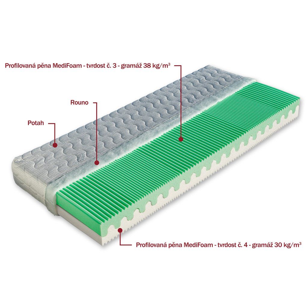 Pětizónová matrace Olga od firmy Dřevočal s volbou dvojí tvrdosti je složená ze dvou velmi kvalitních a elastických pěn MediFoam (28 a 30 kg/m3). Jemná masážní profilace na povrchu těchto pěn přispívá k většímu provzdušnění matrace. Pěny jsou spojeny vlnkovitým profilem bez použití lepidla. Matrace Olga Je vhodná pro ty, kteří upřednostňují tvrdší matrace. Matrace je vhodná na všechny typy roštů. Celková výška matrace Olga je cca 18 cm.Vlastnosti potahůÚpletVysoce kvalitní potah prošitý dutým vláknem. Potah je velmi příjemný na dotek, výborně odvádí vlhkost z těla a rychle vysychá. Potah je možno prát na 60°C. Pro snadnější praní a manipulaci je potah dělitelný zipem na dvě části. Tento nejprodávanější potah poskytuje vysoký standard celé matrace. Složení: 100% polyester.AloeVeraKvalitní potah, který obsahuje výtažek známé rostliny Aloe Vera Barbaensis z rodu liliovitých. Má pozitivní vliv na pokožku lidského těla, působí antibakteriálně. Postupně se uvolňující extrakt z AloeVera umožňuje dokonalou relaxaci ve spánku. Potah, prošitý třízónovým způsobem, je příjemný na dotek a standartně vetkané logo zaručuje nezaměnitelnost výrobku. Potah je pratelný na 60°C. Složení: 100% polyester.SilverGuardSilverGuard je jedinečná technologie, která zaručuje trvalou svěžest a hygienu během spánku. Eliminuje bakterie způsobující zápach a chrání před jejich usazováním. Ochrana je trvalá i po častém praní a čištění. Při kontaktu s pokožkou zachovává její přirozenou rovnováhu. Tento potah obsahuje přírodní viskózové vlákno, které ve spojení s moderním designem dodává textilii luxusní charakter. Zaručuje vám absolutní čistotu a pohodlí. SilverGuard® úprava: Využívá stříbro jako jeden z nejstarších a nejznámějších způsobů ochrany před houbami a bakteriemi. Díky působení stříbrných iontů chrání textilii před mikroorganismy a zabraňuje jejich rozvoji přírodní cestou. SilverGuard® zajišťuje konstantní svěžest a hygienu lůžka, vysokou odolnost proti oděru a žmolkování. Potah je pratelný na 60°C. Složení: 35% viskóza, 2% polyamid, 63% polyester.LyocellMateriál z čistého přírodního vlákna získaného ze dřeva technologií šetřící životní prostředí. Se všemi svými vynikajícími charakteristikami Vám poskytuje během spánku optimální pohodlí. K jeho předním vlastnostem patří vysoká absorpční schopnost a velmi rychlé odpařování. Tyto vlastnosti zaručují dokonalý pocit i pro osoby s vyšší potivostí. Mikrovlákna Lenzing Lyocell dodávají látce hedvábný lesk a jsou odolná a necitlivá k mikroorganismům. Potah je možno prát při 60°C. Složení potahu: 44% lyocell, 33% polyamid, 23% polyester.MedicottZnačkový typ pleteného potahu, který svým speciálním složením zabraňuje tvorbě a usazování domácích roztočů a tvorbu plísní. Roztoči žijí v tmavém, vlhkém a málo odvětrávaném prostředí, a tomu přesně odpovídá vaše postel. Hlavní obživou pro roztoče jsou odpadávající buňky vaší kůže. Ty jsou rozkládány plísněmi a tak se stávají stravitelnými pro prachové roztoče. Plíseň samotná způsobuje alergie spojené s dýchacími symptomy. Medicott je účinná složka látky, která zabraňuje v bavlně nebo v látkách s bavlněným základem vzniku plísní a současně přežití prachových roztočů. Medicott má vynikající antibakteriální účinky, které jsou dosaženy bez přídavku chemických látek. Tajemství úspěšného fungování spočívá v odstranění nečistot z vláken přírodní bavlny, čímž se zamezí potencionálnímu domovu plísní. Potah má dlouhotrvající účinek při pravidelné údržbě. Potah je pratelný na 60°C. Složení: 40% bavlna, 35% polyamid, 25% polyester.LevanduleVelmi příjemná luxusní látka, která obsahuje výtažky levandule lékařské. Levandule je oblíbená léčivá bylinka s charakteristickou vůní, známá pro svoje protizánětlivé, antiseptické a repelentní účinky. Pomáhá proti stresu, depresím, snižuje krevní tlak a potlačuje růst baktérií. Její zklidňující účinky jsou známé už z dávných dob, pozitivně ovlivňují kvalitu spánku, působí proti nespavosti a nervozitě. Levandule pomůže zmírnit svalové napětí a podpořit přirozenou regeneraci organismu. Jemná esence z levandule je skvělým pomocníkem pro hluboký a kvalitní spánek. Potah Lavandule patří mezi nejkvalitnější a nejoblíbenější potahy na trhu a zajistí Vašemu lůžku maximální komfort a hygienu. Potah je pratelný na 60°C. Složení potahu: 30,59% tencel, 69,41% polyester.Doplňkové parametry