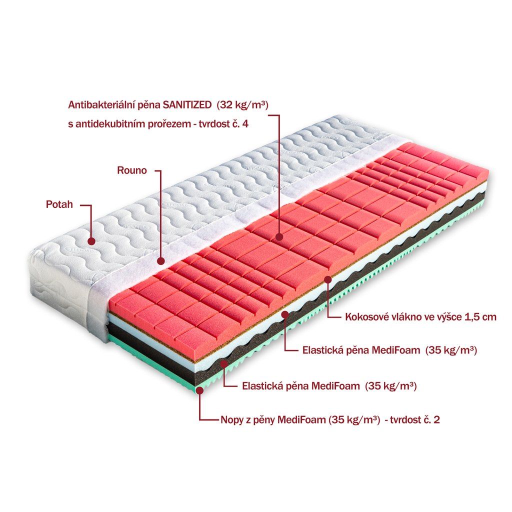 Unikátní ortopedická matrace Renata vhodná také pro alergiky. Jádro matrace se skládá ze dvou odlišných pěn zasazených do sebe podélnou vlnou. Černá pěna o hustotě 35 kg/m³ je příjemně elastická, modrá tvrdší s gramáží 35 kg/m³ s vyšším odporem proti stlačení. Ložnou plochu matrace Renata tvoří antibakteriální pěna s gramáží 32 kg/m³, která má antidekubitní prořez. Pěna je velmi příjemná. Vrstva kokosového vlákna ve výšce 1,5 cm matraci provzdušňuje. Druhou stranu tvoří masážní pěna MediFoam (35 kg/m³) ve tvaru nopů. Pouhým otočením matrace dosáhnete jiné tvrdosti. Je určena pro širokou škálu veřejnosti, která ocení i její výšku. Celková výška matrace Renata je cca 23 cm.Pěna MediFoam - Tato vysoce gramážní pěna, která se vyznačuje skvělými ortopedickými vlastnostmi, je vytvořena speciální technologií. Má dokonalou prodyšnost, pružnost, je tvarově stálá a má dlouhou životnost. Zvýšená pórovitost je velmi dobrá k odvádění tepla z matrace, tato pěna tzv. dýchá. Matrace z pěny MediFoam zajišťují ideální uvolnění páteře, kloubů a svalů po dobu Vašeho spánku. Jsou testované a mají certifikát Textilního zkušebního ústavu, s.p. v Brně. Pěna MediFoam je garancí kvality.Antibakteriální pěna Sanitized® - Speciální antibakteriální pěna s certifikovanou úpravou Sanitized® (biocidní látka- nezávadná, vhodná i pro děti do 3 let), která likviduje baktérie, houby, roztoče, plísně a další nežádoucí mikroorganismy v matraci. Je dermatologicky testována a šetrná vůči pokožce. Matrace z této pěny jsou díky antimikrobiální úpravě Sanitized® jsou revolučním řešením pro alergiky.Vlastnosti potahůÚpletVysoce kvalitní potah prošitý dutým vláknem. Potah je velmi příjemný na dotek, výborně odvádí vlhkost z těla a rychle vysychá. Potah je možno prát na 60°C. Pro snadnější praní a manipulaci je potah dělitelný zipem na dvě části. Tento nejprodávanější potah poskytuje vysoký standard celé matrace. Složení: 100% polyester.AloeVeraKvalitní potah, který obsahuje výtažek známé rostliny Aloe Vera Barbaensis z rodu liliovitých. Má pozitivní vliv na pokožku lidského těla, působí antibakteriálně. Postupně se uvolňující extrakt z AloeVera umožňuje dokonalou relaxaci ve spánku. Potah, prošitý třízónovým způsobem, je příjemný na dotek a standartně vetkané logo zaručuje nezaměnitelnost výrobku. Potah je pratelný na 60°C. Složení: 100% polyester.SilverGuardSilverGuard je jedinečná technologie, která zaručuje trvalou svěžest a hygienu během spánku. Eliminuje bakterie způsobující zápach a chrání před jejich usazováním. Ochrana je trvalá i po častém praní a čištění. Při kontaktu s pokožkou zachovává její přirozenou rovnováhu. Tento potah obsahuje přírodní viskózové vlákno, které ve spojení s moderním designem dodává textilii luxusní charakter. Zaručuje vám absolutní čistotu a pohodlí. SilverGuard® úprava: Využívá stříbro jako jeden z nejstarších a nejznámějších způsobů ochrany před houbami a bakteriemi. Díky působení stříbrných iontů chrání textilii před mikroorganismy a zabraňuje jejich rozvoji přírodní cestou. SilverGuard® zajišťuje konstantní svěžest a hygienu lůžka, vysokou odolnost proti oděru a žmolkování. Potah je pratelný na 60°C. Složení: 35% viskóza, 2% polyamid, 63% polyester.LyocellMateriál z čistého přírodního vlákna získaného ze dřeva technologií šetřící životní prostředí. Se všemi svými vynikajícími charakteristikami Vám poskytuje během spánku optimální pohodlí. K jeho předním vlastnostem patří vysoká absorpční schopnost a velmi rychlé odpařování. Tyto vlastnosti zaručují dokonalý pocit i pro osoby s vyšší potivostí. Mikrovlákna Lenzing Lyocell dodávají látce hedvábný lesk a jsou odolná a necitlivá k mikroorganismům. Potah je možno prát při 60°C. Složení potahu: 44% lyocell, 33% polyamid, 23% polyester.MedicottZnačkový typ pleteného potahu, který svým speciálním složením zabraňuje tvorbě a usazování domácích roztočů a tvorbu plísní. Roztoči žijí v tmavém, vlhkém a málo odvětrávaném prostředí, a tomu přesně odpovídá vaše postel. Hlavní obživou pro roztoče jsou odpadávající buňky vaší kůže. Ty jsou rozkládány plísněmi a tak se stávají stravitelnými pro prachové roztoče. Plíseň samotná způsobuje alergie spojené s dýchacími symptomy. Medicott je účinná složka látky, která zabraňuje v bavlně nebo v látkách s bavlněným základem vzniku plísní a současně přežití prachových roztočů. Medicott má vynikající antibakteriální účinky, které jsou dosaženy bez přídavku chemických látek. Tajemství úspěšného fungování spočívá v odstranění nečistot z vláken přírodní bavlny, čímž se zamezí potencionálnímu domovu plísní. Potah má dlouhotrvající účinek při pravidelné údržbě. Potah je pratelný na 60°C. Složení: 40% bavlna, 35% polyamid, 25% polyester.LevanduleVelmi příjemná luxusní látka, která obsahuje výtažky levandule lékařské. Levandule je oblíbená léčivá bylinka s charakteristickou vůní, známá pro svoje protizánětlivé, antiseptické a repelentní účinky. Pomáhá proti stresu, depresím, snižuje krevní tlak a potlačuje růst baktérií. Její zklidňující účinky jsou známé už z dávných dob, pozitivně ovlivňují kvalitu spánku, působí proti nespavosti a nervozitě. Levandule pomůže zmírnit svalové napětí a podpořit přirozenou regeneraci organismu. Jemná esence z levandule je skvělým pomocníkem pro hluboký a kvalitní spánek. Potah Lavandule patří mezi nejkvalitnější a nejoblíbenější potahy na trhu a zajistí Vašemu lůžku 