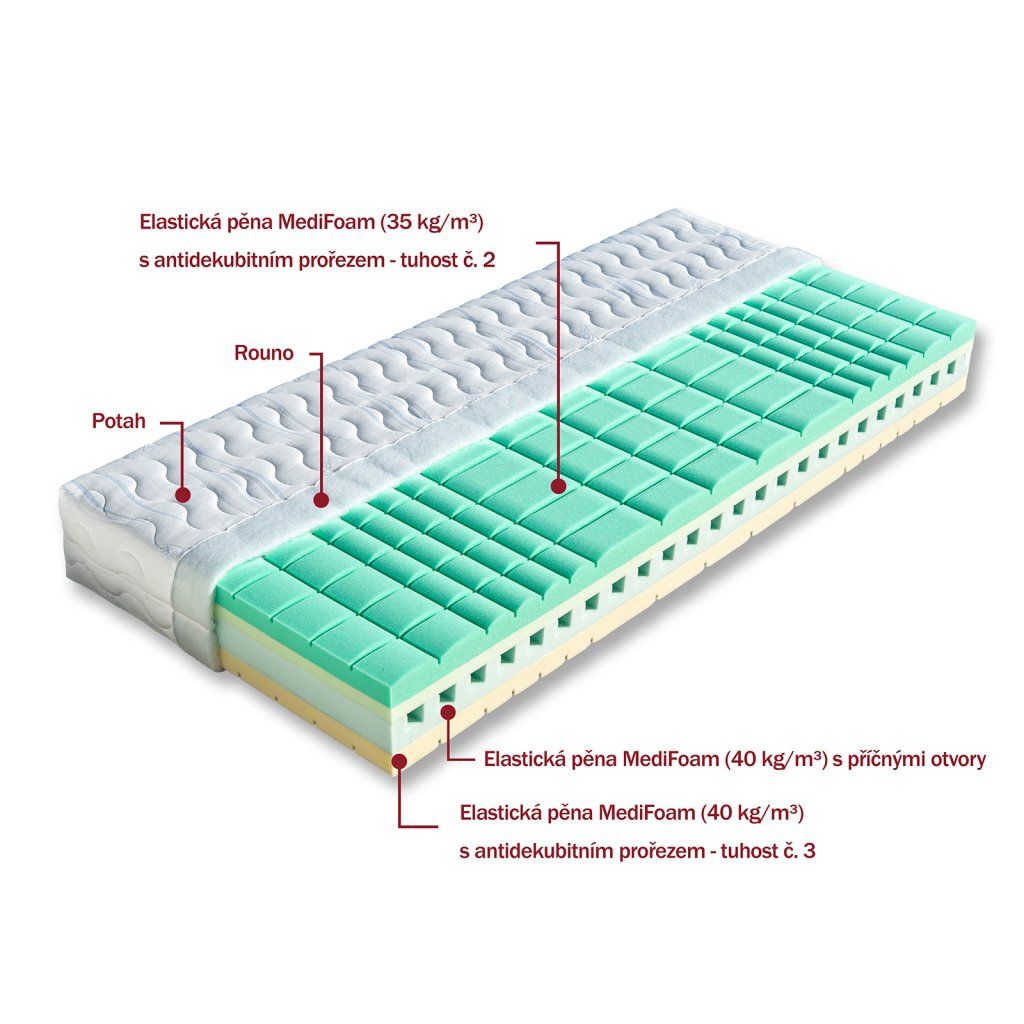 Jádro této pevné matrace Victoria od firmy Dřevočal tvoří tvrzená polyuretanová pěna s příčným profilováním, která zajišťuje vzdušnost. Nosné vrstvy matrace Victoria jsou tvořeny dvěma elastickými MediFoam pěnami rozdílných tuhostí. Jejich antidekubitní průřez zaručí dokonalé kopírování těla a vytváří pevnou oporu páteře v její přirozené poloze. Matrace Victoria je vhodná na všechny typy lamelových roštů i na pevnou desku. Výška matrace Victoria je cca 23 cm.Vlastnosti potahůÚpletVysoce kvalitní potah prošitý dutým vláknem. Potah je velmi příjemný na dotek, výborně odvádí vlhkost z těla a rychle vysychá. Potah je možno prát na 60°C. Pro snadnější praní a manipulaci je potah dělitelný zipem na dvě části. Tento nejprodávanější potah poskytuje vysoký standard celé matrace. Složení: 100% polyester.AloeVeraKvalitní potah, který obsahuje výtažek známé rostliny Aloe Vera Barbaensis z rodu liliovitých. Má pozitivní vliv na pokožku lidského těla, působí antibakteriálně. Postupně se uvolňující extrakt z AloeVera umožňuje dokonalou relaxaci ve spánku. Potah, prošitý třízónovým způsobem, je příjemný na dotek a standartně vetkané logo zaručuje nezaměnitelnost výrobku. Potah je pratelný na 60°C. Složení: 100% polyester.SilverGuardSilverGuard je jedinečná technologie, která zaručuje trvalou svěžest a hygienu během spánku. Eliminuje bakterie způsobující zápach a chrání před jejich usazováním. Ochrana je trvalá i po častém praní a čištění. Při kontaktu s pokožkou zachovává její přirozenou rovnováhu. Tento potah obsahuje přírodní viskózové vlákno, které ve spojení s moderním designem dodává textilii luxusní charakter. Zaručuje vám absolutní čistotu a pohodlí. SilverGuard® úprava: Využívá stříbro jako jeden z nejstarších a nejznámějších způsobů ochrany před houbami a bakteriemi. Díky působení stříbrných iontů chrání textilii před mikroorganismy a zabraňuje jejich rozvoji přírodní cestou. SilverGuard® zajišťuje konstantní svěžest a hygienu lůžka, vysokou odolnost proti oděru a žmolkování. Potah je pratelný na 60°C. Složení: 35% viskóza, 2% polyamid, 63% polyester.LyocellMateriál z čistého přírodního vlákna získaného ze dřeva technologií šetřící životní prostředí. Se všemi svými vynikajícími charakteristikami Vám poskytuje během spánku optimální pohodlí. K jeho předním vlastnostem patří vysoká absorpční schopnost a velmi rychlé odpařování. Tyto vlastnosti zaručují dokonalý pocit i pro osoby s vyšší potivostí. Mikrovlákna Lenzing Lyocell dodávají látce hedvábný lesk a jsou odolná a necitlivá k mikroorganismům. Potah je možno prát při 60°C. Složení potahu: 44% lyocell, 33% polyamid, 23% polyester.MedicottZnačkový typ pleteného potahu, který svým speciálním složením zabraňuje tvorbě a usazování domácích roztočů a tvorbu plísní. Roztoči žijí v tmavém, vlhkém a málo odvětrávaném prostředí, a tomu přesně odpovídá vaše postel. Hlavní obživou pro roztoče jsou odpadávající buňky vaší kůže. Ty jsou rozkládány plísněmi a tak se stávají stravitelnými pro prachové roztoče. Plíseň samotná způsobuje alergie spojené s dýchacími symptomy. Medicott je účinná složka látky, která zabraňuje v bavlně nebo v látkách s bavlněným základem vzniku plísní a současně přežití prachových roztočů. Medicott má vynikající antibakteriální účinky, které jsou dosaženy bez přídavku chemických látek. Tajemství úspěšného fungování spočívá v odstranění nečistot z vláken přírodní bavlny, čímž se zamezí potencionálnímu domovu plísní. Potah má dlouhotrvající účinek při pravidelné údržbě. Potah je pratelný na 60°C. Složení: 40% bavlna, 35% polyamid, 25% polyester.Doplňkové parametry