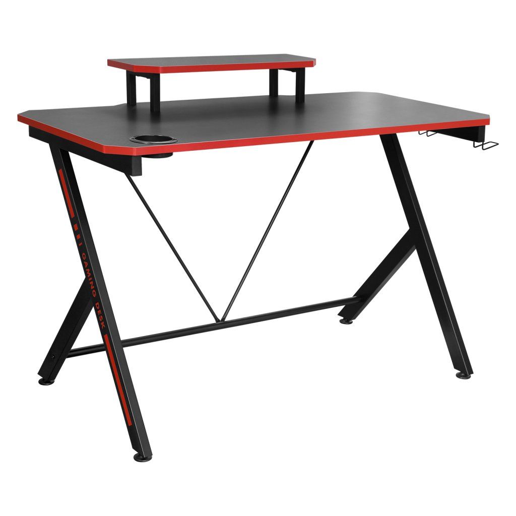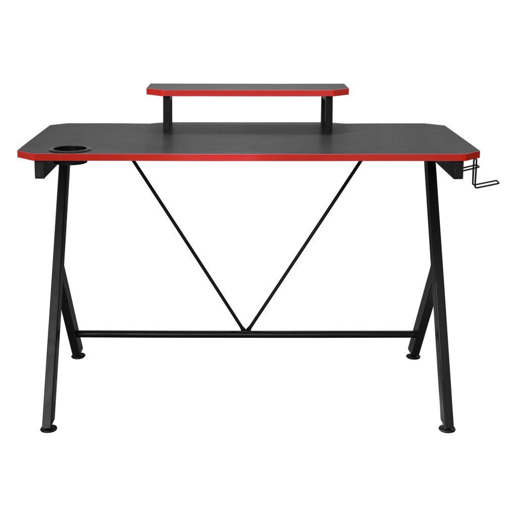 barevné provedení černá / červená kovová konstrukce, horní desky ve vzhledu materiálu z karbonových vláken police na monitor, držák na nápoje, dva háčky na příslušenství zadní hrana stolu vykrojená na protažení kabelůDoplňkové parametry