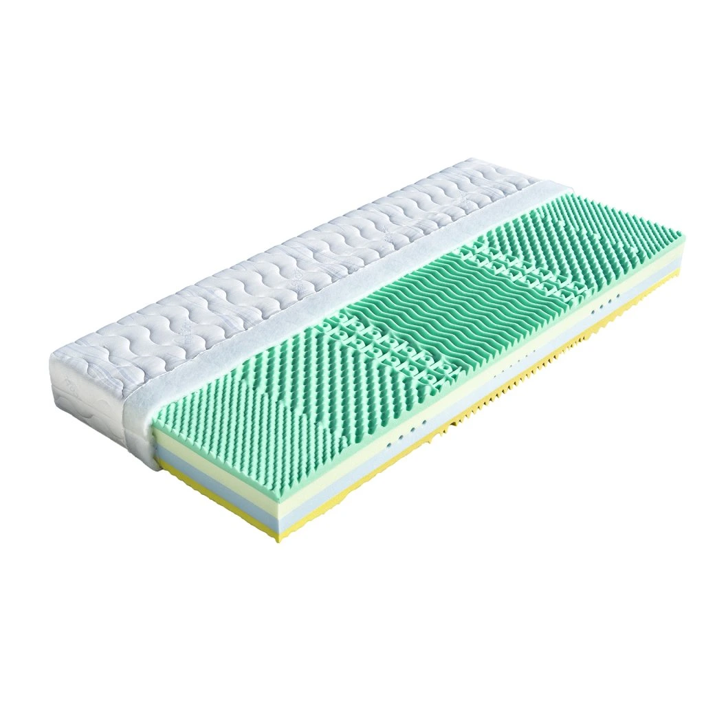 Jádro matrace je tvořeno kombinací desek dvou studených pěn s odlišnou tuhostí. Střed jádra tvoří příčné průduchy, které zajišťují provzdušnění matrace. Nosné vrstvy jsou oboustranně tvořeny ze studené pěny s příměsí oleje ze skočce obecného v různých tuhostech. Vrstvy jsou tvarované do masážních nopů v sedmi zónách. Matraci je vhodné položit na pevný nebo polohovací lamelový rošt.Vlastnosti potahůÚpletVysoce kvalitní potah prošitý dutým vláknem. Potah je velmi příjemný na dotek, výborně odvádí vlhkost z těla a rychle vysychá. Potah je možno prát na 60°C. Pro snadnější praní a manipulaci je potah dělitelný zipem na dvě části. Tento nejprodávanější potah poskytuje vysoký standard celé matrace. Složení: 100% polyester.AloeVeraKvalitní potah, který obsahuje výtažek známé rostliny Aloe Vera Barbaensis z rodu liliovitých. Má pozitivní vliv na pokožku lidského těla, působí antibakteriálně. Postupně se uvolňující extrakt z AloeVera umožňuje dokonalou relaxaci ve spánku. Potah, prošitý třízónovým způsobem, je příjemný na dotek a standartně vetkané logo zaručuje nezaměnitelnost výrobku. Potah je pratelný na 60°C. Složení: 100% polyester.SilverGuardSilverGuard je jedinečná technologie, která zaručuje trvalou svěžest a hygienu během spánku. Eliminuje bakterie způsobující zápach a chrání před jejich usazováním. Ochrana je trvalá i po častém praní a čištění. Při kontaktu s pokožkou zachovává její přirozenou rovnováhu. Tento potah obsahuje přírodní viskózové vlákno, které ve spojení s moderním designem dodává textilii luxusní charakter. Zaručuje vám absolutní čistotu a pohodlí. SilverGuard® úprava: Využívá stříbro jako jeden z nejstarších a nejznámějších způsobů ochrany před houbami a bakteriemi. Díky působení stříbrných iontů chrání textilii před mikroorganismy a zabraňuje jejich rozvoji přírodní cestou. SilverGuard® zajišťuje konstantní svěžest a hygienu lůžka, vysokou odolnost proti oděru a žmolkování. Potah je pratelný na 60°C. Složení: 35% viskóza, 2% polyamid, 63% polyester.LyocellMateriál z čistého přírodního vlákna získaného ze dřeva technologií šetřící životní prostředí. Se všemi svými vynikajícími charakteristikami Vám poskytuje během spánku optimální pohodlí. K jeho předním vlastnostem patří vysoká absorpční schopnost a velmi rychlé odpařování. Tyto vlastnosti zaručují dokonalý pocit i pro osoby s vyšší potivostí. Mikrovlákna Lenzing Lyocell dodávají látce hedvábný lesk a jsou odolná a necitlivá k mikroorganismům. Potah je možno prát při 60°C. Složení potahu: 44% lyocell, 33% polyamid, 23% polyester.MedicottZnačkový typ pleteného potahu, který svým speciálním složením zabraňuje tvorbě a usazování domácích roztočů a tvorbu plísní. Roztoči žijí v tmavém, vlhkém a málo odvětrávaném prostředí, a tomu přesně odpovídá vaše postel. Hlavní obživou pro roztoče jsou odpadávající buňky vaší kůže. Ty jsou rozkládány plísněmi a tak se stávají stravitelnými pro prachové roztoče. Plíseň samotná způsobuje alergie spojené s dýchacími symptomy. Medicott je účinná složka látky, která zabraňuje v bavlně nebo v látkách s bavlněným základem vzniku plísní a současně přežití prachových roztočů. Medicott má vynikající antibakteriální účinky, které jsou dosaženy bez přídavku chemických látek. Tajemství úspěšného fungování spočívá v odstranění nečistot z vláken přírodní bavlny, čímž se zamezí potencionálnímu domovu plísní. Potah má dlouhotrvající účinek při pravidelné údržbě. Potah je pratelný na 60°C. Složení: 40% bavlna, 35% polyamid, 25% polyester.Kiegészítő paraméterek