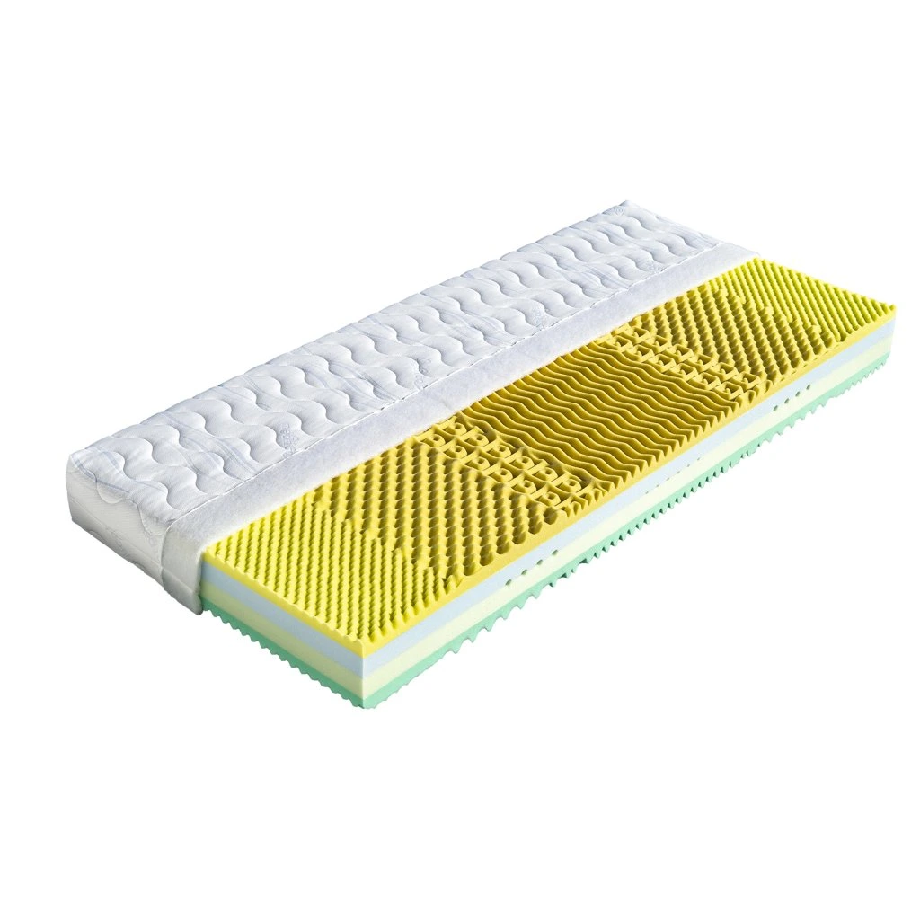 Jádro matrace je tvořeno kombinací desek dvou studených pěn s odlišnou tuhostí. Střed jádra tvoří příčné průduchy, které zajišťují provzdušnění matrace. Nosné vrstvy jsou oboustranně tvořeny ze studené pěny s příměsí oleje ze skočce obecného v různých tuhostech. Vrstvy jsou tvarované do masážních nopů v sedmi zónách. Matraci je vhodné položit na pevný nebo polohovací lamelový rošt.Vlastnosti potahůÚpletVysoce kvalitní potah prošitý dutým vláknem. Potah je velmi příjemný na dotek, výborně odvádí vlhkost z těla a rychle vysychá. Potah je možno prát na 60°C. Pro snadnější praní a manipulaci je potah dělitelný zipem na dvě části. Tento nejprodávanější potah poskytuje vysoký standard celé matrace. Složení: 100% polyester.AloeVeraKvalitní potah, který obsahuje výtažek známé rostliny Aloe Vera Barbaensis z rodu liliovitých. Má pozitivní vliv na pokožku lidského těla, působí antibakteriálně. Postupně se uvolňující extrakt z AloeVera umožňuje dokonalou relaxaci ve spánku. Potah, prošitý třízónovým způsobem, je příjemný na dotek a standartně vetkané logo zaručuje nezaměnitelnost výrobku. Potah je pratelný na 60°C. Složení: 100% polyester.SilverGuardSilverGuard je jedinečná technologie, která zaručuje trvalou svěžest a hygienu během spánku. Eliminuje bakterie způsobující zápach a chrání před jejich usazováním. Ochrana je trvalá i po častém praní a čištění. Při kontaktu s pokožkou zachovává její přirozenou rovnováhu. Tento potah obsahuje přírodní viskózové vlákno, které ve spojení s moderním designem dodává textilii luxusní charakter. Zaručuje vám absolutní čistotu a pohodlí. SilverGuard® úprava: Využívá stříbro jako jeden z nejstarších a nejznámějších způsobů ochrany před houbami a bakteriemi. Díky působení stříbrných iontů chrání textilii před mikroorganismy a zabraňuje jejich rozvoji přírodní cestou. SilverGuard® zajišťuje konstantní svěžest a hygienu lůžka, vysokou odolnost proti oděru a žmolkování. Potah je pratelný na 60°C. Složení: 35% viskóza, 2% polyamid, 63% polyester.LyocellMateriál z čistého přírodního vlákna získaného ze dřeva technologií šetřící životní prostředí. Se všemi svými vynikajícími charakteristikami Vám poskytuje během spánku optimální pohodlí. K jeho předním vlastnostem patří vysoká absorpční schopnost a velmi rychlé odpařování. Tyto vlastnosti zaručují dokonalý pocit i pro osoby s vyšší potivostí. Mikrovlákna Lenzing Lyocell dodávají látce hedvábný lesk a jsou odolná a necitlivá k mikroorganismům. Potah je možno prát při 60°C. Složení potahu: 44% lyocell, 33% polyamid, 23% polyester.MedicottZnačkový typ pleteného potahu, který svým speciálním složením zabraňuje tvorbě a usazování domácích roztočů a tvorbu plísní. Roztoči žijí v tmavém, vlhkém a málo odvětrávaném prostředí, a tomu přesně odpovídá vaše postel. Hlavní obživou pro roztoče jsou odpadávající buňky vaší kůže. Ty jsou rozkládány plísněmi a tak se stávají stravitelnými pro prachové roztoče. Plíseň samotná způsobuje alergie spojené s dýchacími symptomy. Medicott je účinná složka látky, která zabraňuje v bavlně nebo v látkách s bavlněným základem vzniku plísní a současně přežití prachových roztočů. Medicott má vynikající antibakteriální účinky, které jsou dosaženy bez přídavku chemických látek. Tajemství úspěšného fungování spočívá v odstranění nečistot z vláken přírodní bavlny, čímž se zamezí potencionálnímu domovu plísní. Potah má dlouhotrvající účinek při pravidelné údržbě. Potah je pratelný na 60°C. Složení: 40% bavlna, 35% polyamid, 25% polyester.Kiegészítő paraméterek