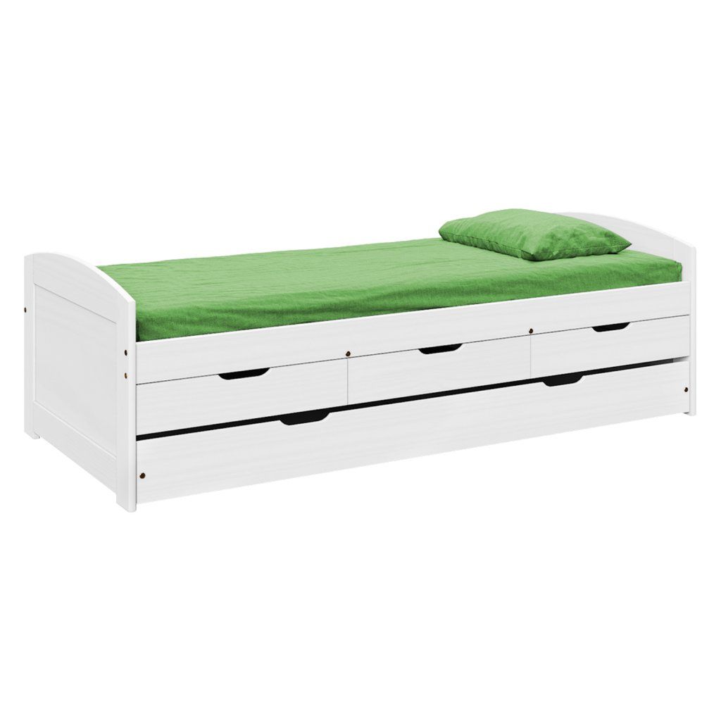 materiál masiv borovice, barevné provedení bílý lak model ULLI, výška sedu 52 cm, praktické úložné prostory pod postelí (3 zásuvky a výsuv) jsou v ceně cena včetně roštu (dřevěný laťkový) bez matrace, doporučený rozměr matrace 90 × 200 cm doporučená výška matrace pro přistýlku je do 10 cmDoplňkové parametry