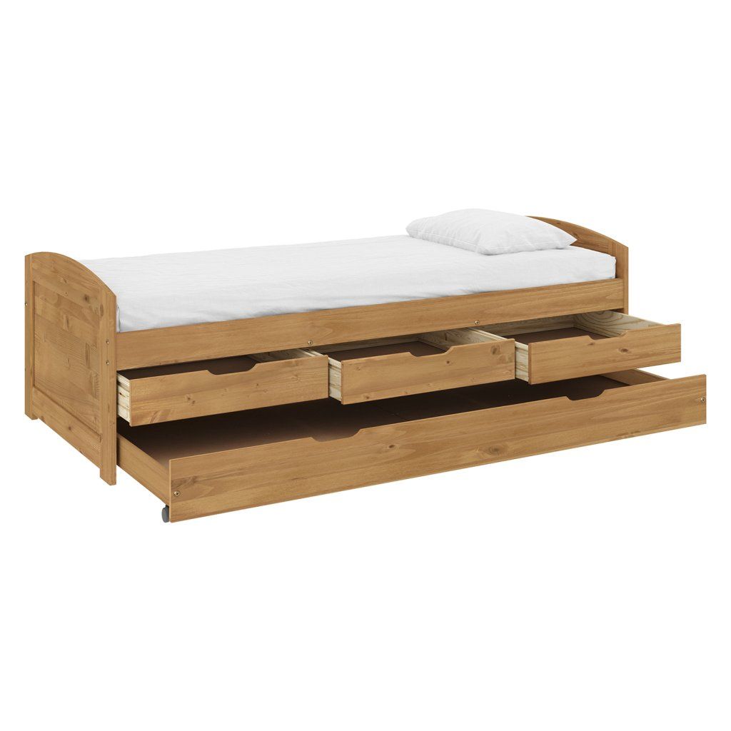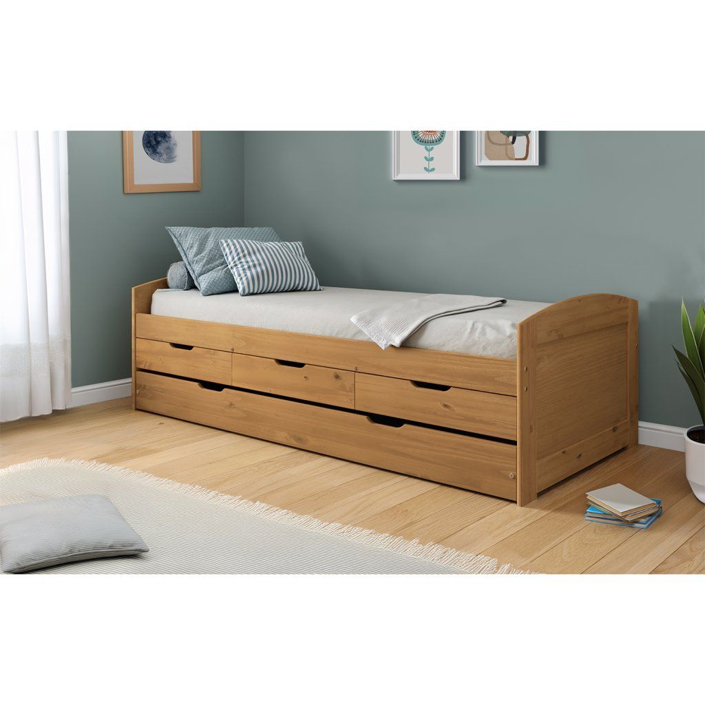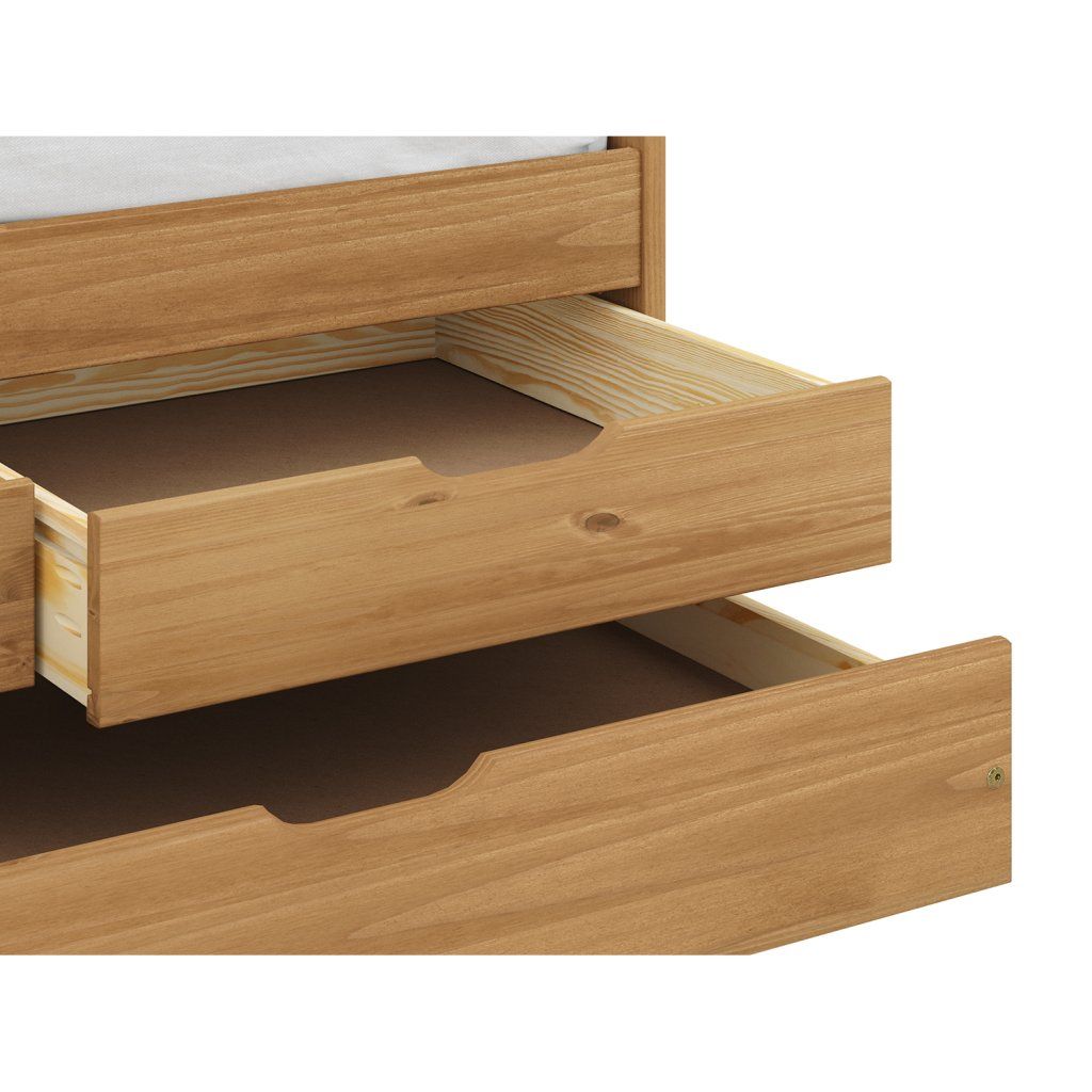 materiál masiv borovice, voskované provedení praktické úložné prostory pod postelí (3 zásuvky) v ceně cena včetně roštu (dřevěný laťkový), matrace není v ceně doporučený rozměr matrace 90 × 200 cm (M2, M5, M9, M12, M24, M26) výsuv možno využít jako úložný prostor nebo jako přistýlku doporučená výška matrace pro přistýlku 10 cmDoplňkové parametry
