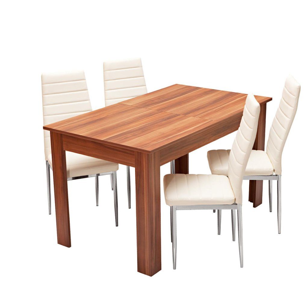 jídelní stůl 61605 a 4 jídelní židle MILÁNO 3009 stůl: barevné provedení ořech, rozložitelný výsuvný díl 42 cm, rozměr rozloženého stolu (š/h/v) 180 × 80 × 76 cm židle: potah kůže – imitace, barevné provedení krémově bílá kovové pochromované nohy, výška sedu 46 cm rozměr stolu (š/h/v) 138 × 80 × 76 cm rozměr židle (š/h/v) 41 × 40 × 98 cmDoplňkové parametry