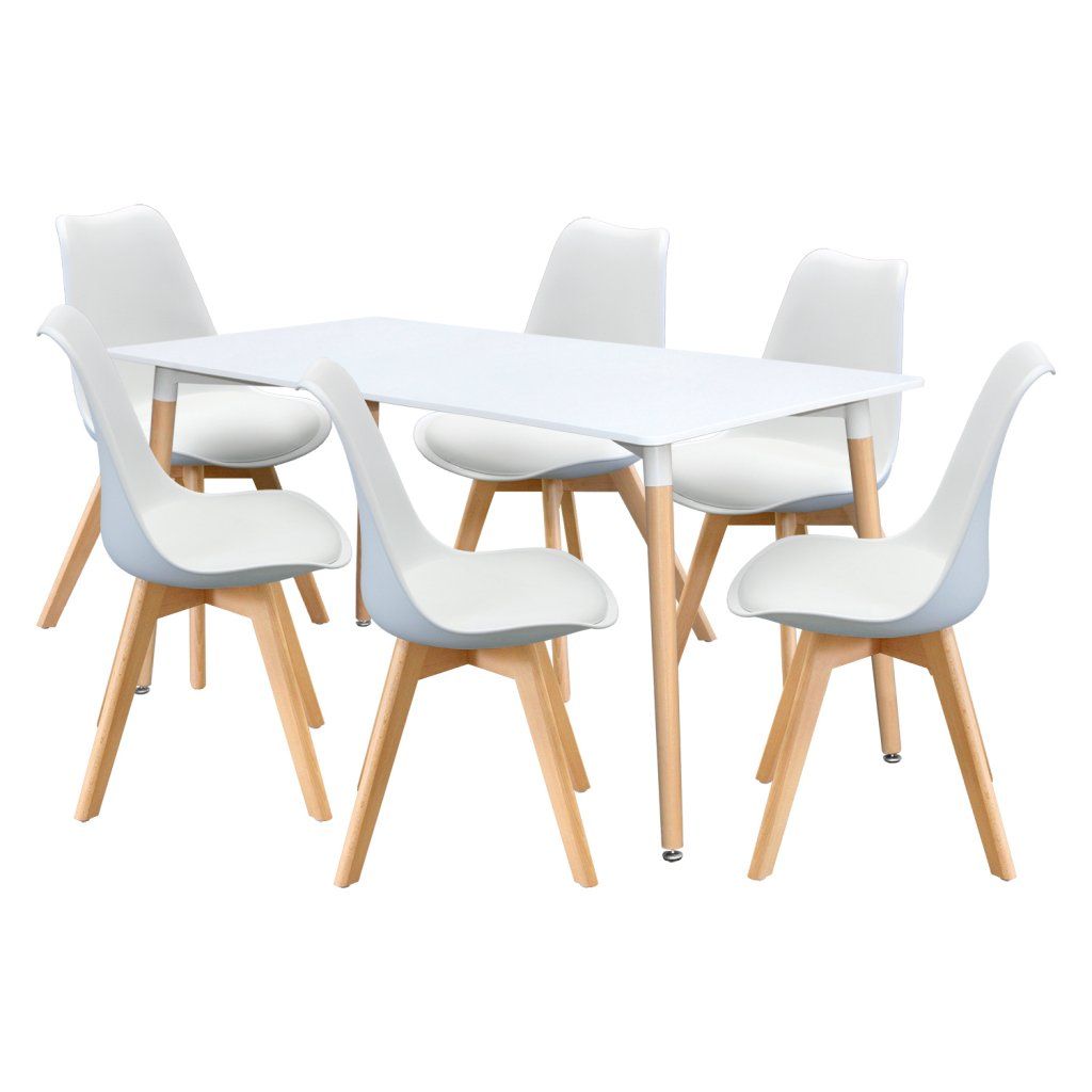 jídelní stůl 3153 a 6 jídelních židlí 3148 stůl: deska MDF, barevné provedení bílá kovová konstrukce, barevné provedení bílá kulaté nohy, materiál masiv buk nastavitelné plastové kluzáky s pochromovanou krytkou židle: korpus PP, sedák kůže – imitace, barevné provedení bílá nohy masiv buk, výška sedu židle 46 cm rozměr stolu (š/h/v): 160 × 90 × 74 cm rozměr židle (š/h/v): 49 × 54 × 83 cmDoplňkové parametry