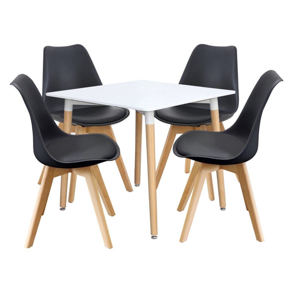 jídelní stůl 3150 a 4 jídelní židle 3144 stůl: deska MDF, barevné provedení bílá kovová konstrukce, barevné provedení bílá kulaté nohy, materiál masiv buk nastavitelné plastové kluzáky s pochromovanou krytkou židle: korpus PP, sedák kůže – imitace, barevné provedení černá nohy masiv buk, výška sedu židle 46 cm rozměr stolu (š/h/v): 80 × 80 × 74 cm rozměr židle (š/h/v): 49 × 54 × 83 cmDoplňkové parametry