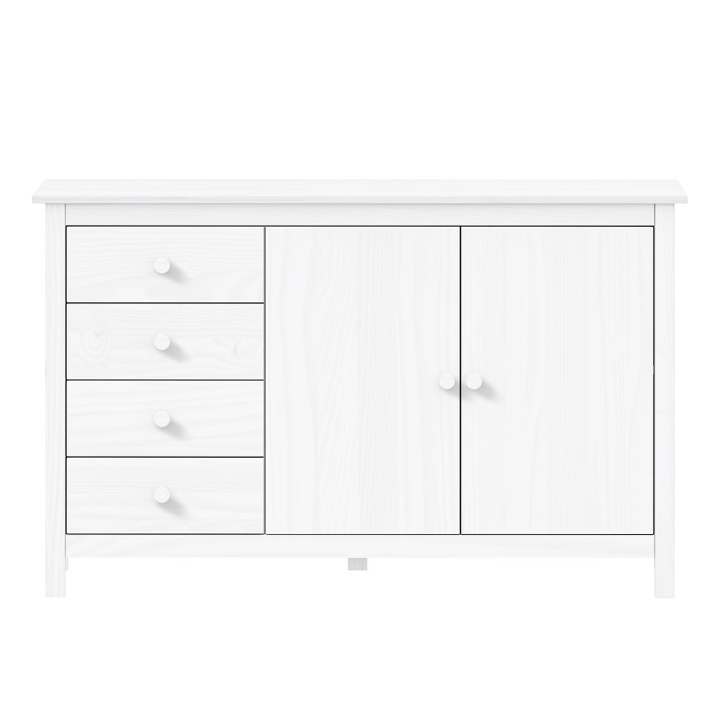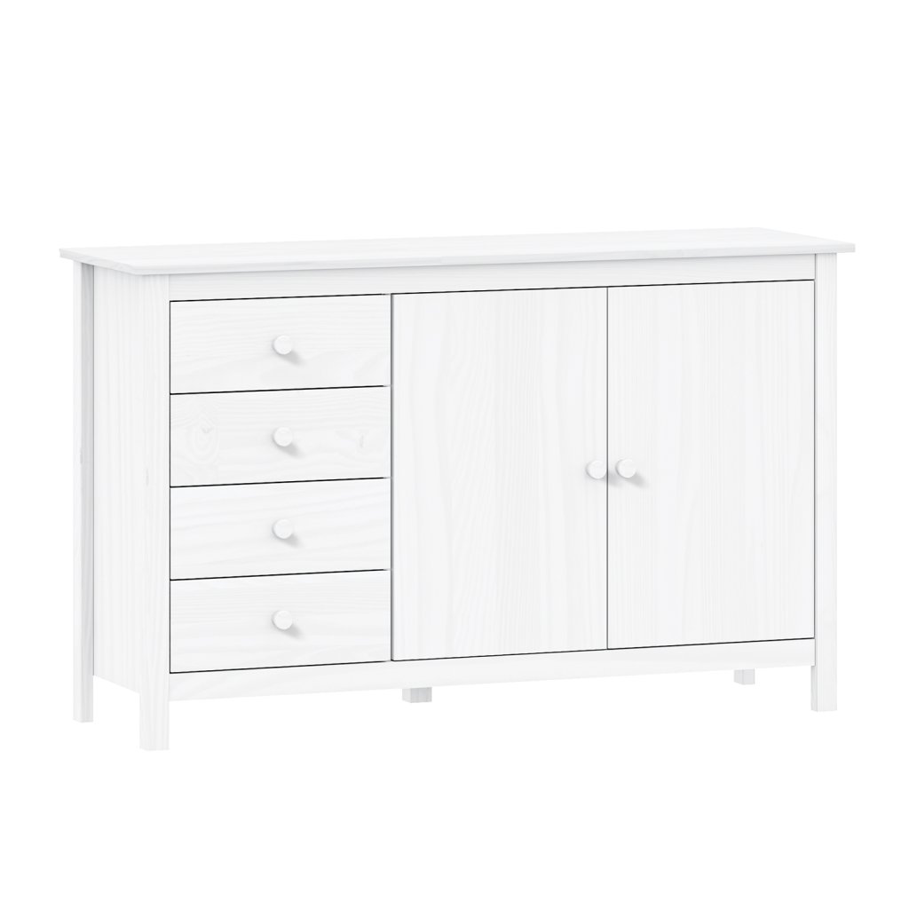 materiál masiv borovice, barevné provedení bílý lak 4 zásuvky s kovovými pojezdy, 2 plné dveře, 1 policeDoplňkové parametry