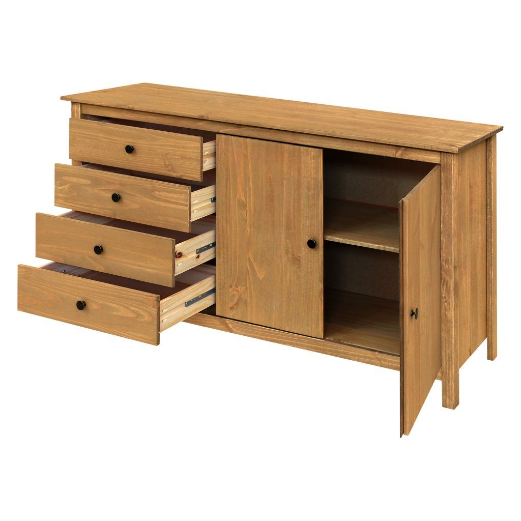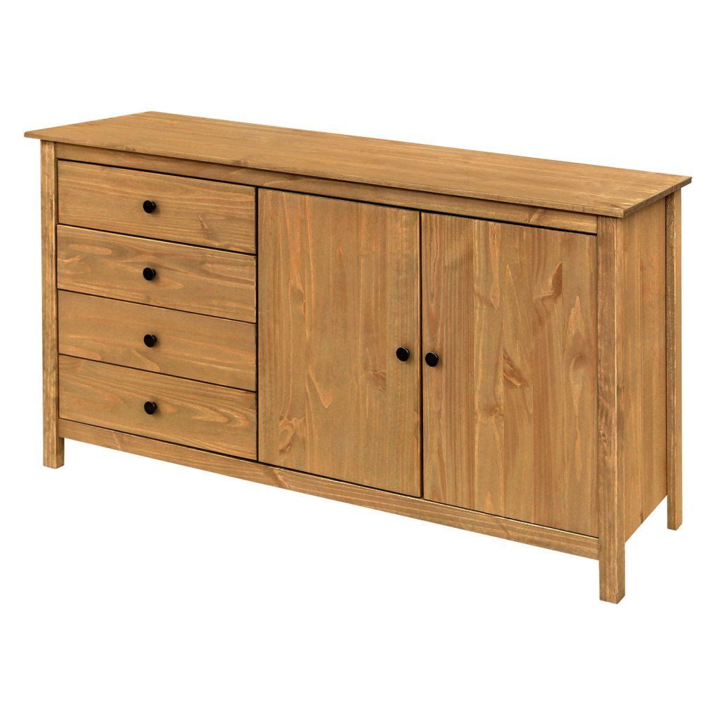 materiál masiv borovice voskovaná v medovém odstínu kovové úchytky v barevném provedení černěná mosaz 4 zásuvky s kovovými pojezdy, 2 plné dveře, 1 policeDoplňkové parametry