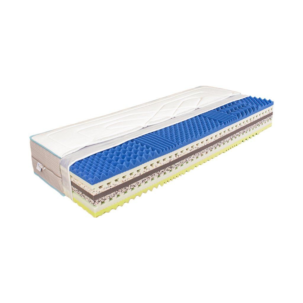 Vysoká a velice pohodlná matrace Tore od firmy Mabo z osvědčených materiálů a vrstvou z viskoelastické pěny se zárukou 5 let! Tužší střed a tvarované vrstvy z kvalitních pěn v celkové výšce 26 cm zaručují vysoký komfort při ležení srovnatelný s výrobky vyšší třídy. Použité jsou pěny gramáže 32 kg/m3. Viskoelastická pěna Breeze s mimořádnou prodyšností (až 6x vyšší něž běžné viskoelastické pěny na trhu) spolehlivě odvádí teplo a vlhko od pokožky. Jádro matrace Tore chrání separační úplet. Matraci Tore doporučujeme položit na rošt z pevných latí.Potah MitchVelmi kvalitní potah z pleteniny Jersey obsahující polyester a bavlnu. Potah je plošně prošitý PES rounem gramáže 200 gr/m2 a pleteninou Lacoste. Čtyřstranný zip umožňuje rozepnutí potahu na dvě poloviny pro snažší praní a sušení. Potah je pratelný maximálně při 60°C. Nové unikátní provedení potahů s velkým celoplošným vzorem podle nejnovějších trendů. Tyto potahy jsou pevnější, odolnější a především zvyšují komfort ležení. Díky jedinečným použitým materiálům si potah udržuje dlouhodobě svůj tvar a plastický vzor na rozdíl od potahů s PES rounem. Celková gramáž výplně je u potahu Mitch 470 g/m2. Pro výplň používáme speciální, pro tento účel vyvinutou elastickou a prodyšnou pěnu s vysokou gramáží (25 kg/m3). Ta dodává potahu potřebnou pružnost.Potah BasicPotah je plošně prošitý PES rounem 200 gr/m2. Složení potahu je 37% Bavlna a 63% PES rouno. Potah je pratelný na 60°C. Potah je příjemný na omak a výborně absorbuje vlhkost.Doplňkové parametry