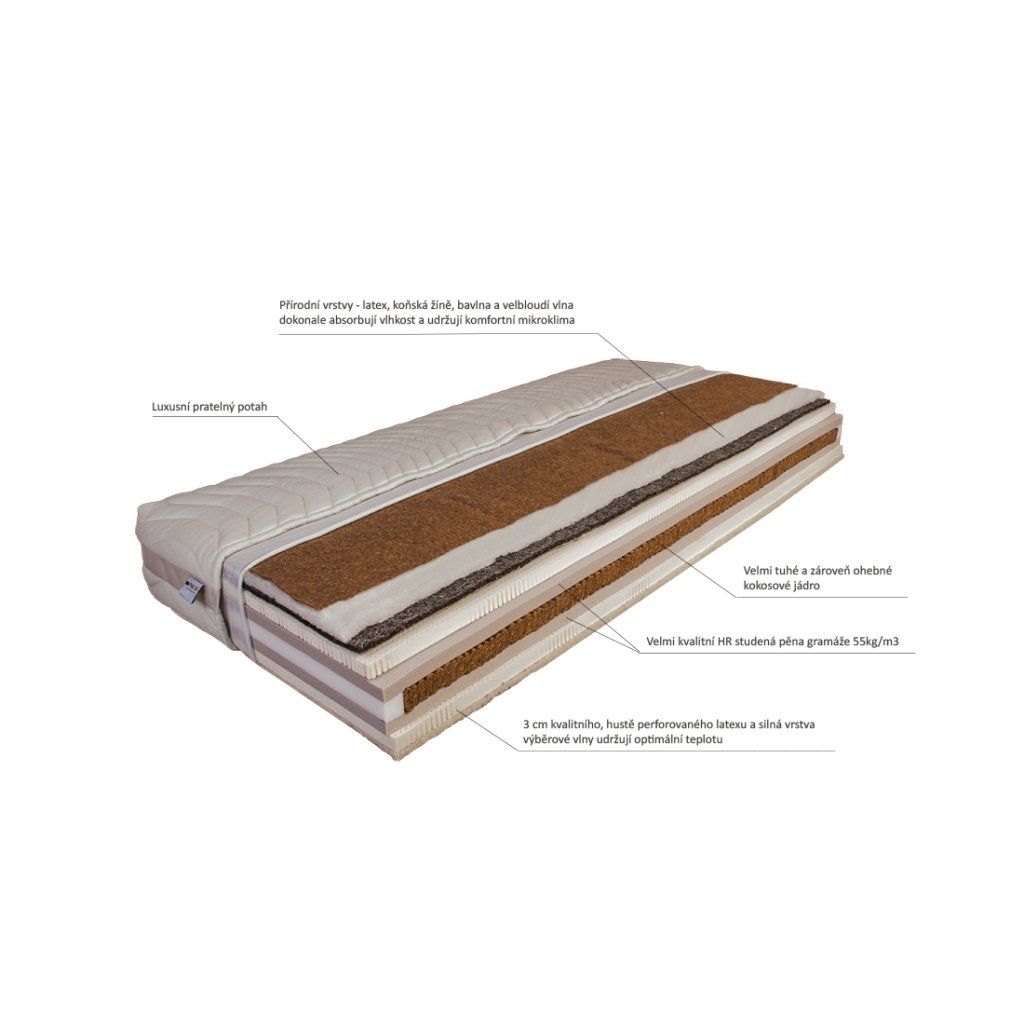 Velmi kvalitní matrace Viola od výrobce Mabo na bázi přírodních materiálů pro všechny,kteří rádi leží na tuhé matraci. Koňská žíně, sisal, bavlna, vlna,velbloudí vlna a latex se postarají o dokonalé odvádění vlhkosti a vytvářejí optimální podmínky pro klidné spaní. Matrace Viola je velmi tuhá ale zároveň bez problémů zvládne výrazné polohování například na motorovém polohovacím roštu.Letní strana matrace Viola je vrstvena z přírodních materiálů –sisal, koňské žíně, 100% bavlna a 100% velbloudí vlna. Zimní stranu matrace Viola tvoří latex s vyšší gramáží, sisal a 100% ovčí vlna. Přírodní materiály dodávají matraci specifické vlastnosti. Ovčí a velbloudí vlna fungují jako regulátor teploty, díky absorbci, případně uvolňování vlhkosti dokáží v létě chladit a v zimně hřát. Koňská žíně dokáže pojmout velké množství vlhkosti aniž by to bylo při doteku znát. Tuto vlhkost opět uvolní, když zrovna neležíte. Latexová vrstva působí navíc antibakteriálně, neboť přírodní latex vytváří nevhodné prostředí pro život roztočů. Všechny tyto vrstvy jsou mimořádně prodyšné, což poznáte při ležení na příjemném suchém povrchu.Jádro matrace Viola od výrobce Mabo je chráněno separačním úpletem. Matrace Mabo mají pro snadnější manipulaci a praní potah dělitelný zipem na dvě poloviny. Matrace Viola je vhodná na laťový rošt Compact nebo pevnou podložku. Přírodní materiály mohou mít specifický zápach, který není závadou a postupem času se ztrácí.tuhé, ale ohebné jádro z tvrzené desky z kokosových vlákenšpičkové HR studené pěny gramáže 55 kg/m3velmi kvalitní latex s hustou perforacípřírodní vrstvy udržují optimální mikroklimaletní a zimní stranaluxusní snímatelný a pratelný potahPotah SilverPotah z třívrstvé pleteniny vysoké gramáže. Prodyšný potah s obsahem viskózy a stříbra, plošně prošitý 350g PES rounem a spodní pleteninou lacoste. Potah je díky obsahu viskózy velmi příjemný na omak a výborně absorbuje vlhkost. Stříbro působí proti bakteriím, udržuje potah čistý a bez zápachu. 3D mřížka po obvodu matrace zlepšuje cirkulaci vzduchu. Potah má čtyřstranný zip a je pratelný maximálně při 60°C.Potah BambusBambus – tato matracová pletenina obsahuje bambusové vlákno,které je extrahováno přímo z bambusového stébla. Bambusové vlákno dodává potahu příjemnou měkkost a pevnost. Dokáže ve větší míře přijímat vlhkost a odvádět ji do okolí. Vytváří tím optimální mikroklima. Pletenina gramáže 320 gr/m2 je prošita PES rounem 350 gr/m2 a PES pleteninou Lacoste. Čtyřstranný zip umožňuje rozepnout potah na dvě poloviny pro snažší praní a sušení. Potah je pratelný maximálně při 60°C.Potah Bio bavlnaPotah je plošně prošitý PES rounem 200 gr/m2. Složení látky 100% bavlna. Potah je pratelný na 30ºC v běžné pračce. Potah je příjemný na omak a výborně absorbuje vlhkost, zároveň je velmi odolný díky vysoké hustotě povrchové bavlny. Bio bavlna pomáhá vytvářet optimální mikroklima mezi pokožkou a povrchem matrace.Doplňkové parametry
