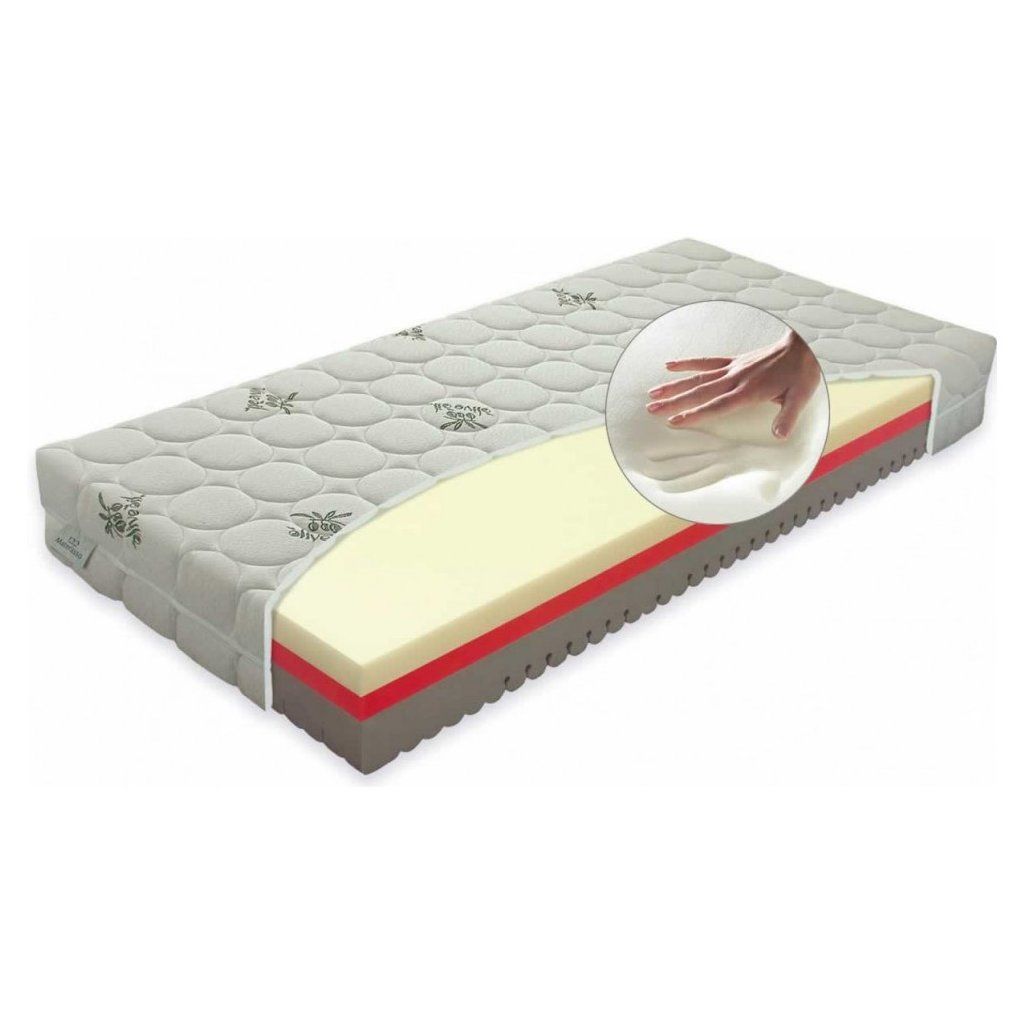 Komfortní sendvičová matrace Comfort Antibacterial od firmy Materasso kombinuje tři vynikající materiály, visco (línou, paměťovou) pěnu, antibakteriální pěnu Sanitized, a studenou pěnu Nightfly. Vrchní roznášecí vrstva je z visco pěny, která při kontaktu s lidským tělem optimalizuje svou tvrdost podle absorbování tepla a zaručuje přizpůsobení matrace jakémukoliv zatížení. Ideálně rovnoměrně podpírá tělo. Podkladová vrstva matrace Comfort Antibacterial Sanitized a Nightfly ještě více umocní kopírovací schopnost visco pěny. Nightfly je profilovaná do 7 antomických zón s antidekubitním prořezem zabraňujícím proleženínám. Tento prořez se dlouhodobě využívá ve zdravotnictví. Matrace Comfort Antibacterial je vhodná pro komfortní spánek, bolesti zad i dlouhodobě nemocné.Potah OlivOilZpomaluje proces stárnutí pokožky spícího člověka, omezuje tvorbu vrásek i ostatních stop ubíhajícího času. Tento efekt je založen na použití mikrokapslí, které postupně uvolňují užitečné látky do naší pokožky a zároveň zajišťují správnou hydrataci pokožky blížící se jejímu přírozenému pH. Hydratovaná pokožka je pružnější a odolnější vůči mikropoškozením. Potah byl navržen tak, aby ulehčil dýchání celým povrchem pokožky a přebíral od ní přebytečné teplo a vlhkost. Užitná hodnota potahu nezmizí ani po praní, které je povoleno až do teploty 60°C.Potah SilkTouchTato exkluzivní látka byla vyrobena s využitím nanotechnologií. Díky nanovláknům získal Silk Touch jemnost hedvábí. Struktura látky v sobě spojuje výjimečnou lehkost a pružnost materiálu. Potah SilkTouch je svou hebkostí mimořádně příjemný na dotek. Poskytuje výjimečný a neopakovatelný komfort spánku. Potah je snímatelný dělitelný na dvě části a pratelný do 60°C.O firmě MaterassoPokud značku Materasso neznáte, pak vězte, že to nejsou pouze kvalitní a oblíbené matrace, ale i postele, rošty a další doplňky, které spojuje jediný účel použití – pomáhat jejich uživatelům ke zdravějšímu a vydatnějšímu spánku. Společnost Materasso působí v matracovém průmyslu více než 20 let a v současnosti se řadí k nejinovativnějším evropským výrobcům. Díky této dlouholeté zkušenosti, spojení moderních technologií s ruční výrobou a používání přírodních materiálů té nejvyšší kvality se firma stala lídrem určujícím nové trendy ve zdravém spaní. Materasso je držitelem mnoha certifikátů a ocenění.Doplňkové parametry
