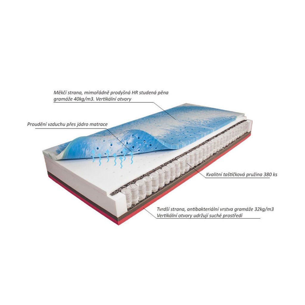 Velmi pohodlná a vysoká pružinová matrace Eget od firmy Mabo s antibakteriální úpravou a zárukou 5 let! Výška matrace výrazně zvyšuje komfort při ležení. Lehací vrstvy matrace Eget jsou upraveny otvory tak, aby dokonale odváděly vlhkost od uživatele. Tvrdší strana z antibakteriální pěny gramáže 32 kg, měkčí strana je vytvořena mimořádně prodyšnou HR pěnou nové generace EUCAFEEL gramáže 40 kg. Kvalitní odolná taštičková pružina s 380 ks pružinek. Jádro matrace Eget je chráněno separačním úpletem. Pratelný potah s velkým obsahem bavlny s vyokým prošitím. Potah matrace Eget je vybaven zipem pro snažší praní a manipulaci.Matraci Eget doporučujeme položit na pevné laťové rošty nebo pevnou podložku.Potah MitchVelmi kvalitní potah z pleteniny Jersey obsahující polyester a bavlnu. Potah je plošně prošitý PES rounem gramáže 200 gr/m2 a pleteninou Lacoste. Čtyřstranný zip umožňuje rozepnutí potahu na dvě poloviny pro snažší praní a sušení. Potah je pratelný maximálně při 60°C. Nové unikátní provedení potahů s velkým celoplošným vzorem podle nejnovějších trendů. Tyto potahy jsou pevnější, odolnější a především zvyšují komfort ležení. Díky jedinečným použitým materiálům si potah udržuje dlouhodobě svůj tvar a plastický vzor na rozdíl od potahů s PES rounem. Celková gramáž výplně je u potahu Mitch 470 g/m2. Pro výplň používáme speciální, pro tento účel vyvinutou elastickou a prodyšnou pěnu s vysokou gramáží (25 kg/m3). Ta dodává potahu potřebnou pružnost.Potah BasicPotah je plošně prošitý PES rounem 200 gr/m2. Složení potahu je 37% Bavlna a 63% PES rouno. Potah je pratelný na 60°C. Potah je příjemný na omak a výborně absorbuje vlhkost.Doplňkové parametry