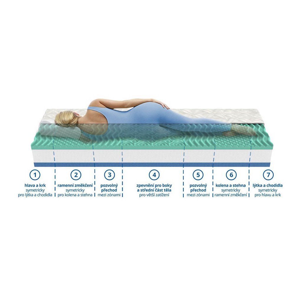 Ortopedická matrace Aloe Comfort 1+1 se 7 anatomickými zónami a nosností do 130 kg od tradičního čaského výrobce MPO má vynikající ortopedické vlastnosti. Silná vrstva kvalitní viscoelastické pěny zajistí dokonalé vnoření těla do matrace a výbornou oporu svalů a páteře. Je to modernější varianta ortopedické matrace 1+1 Memory Comfort doplněná o vrstvu paměťové pěny s extrakty z rostliny Aloe Vera. Aloe vera je hojně používaná v lékařství a kosmetice. Blahodárné účinky jsou známé celá tisíciletí.Silná vrstva kvalitní viscoelastické paměťové pěny zajistí dokonalé vnoření těla do matrace a zárověň výbornou oporu svalů a páteře. Je vhodná při bolestech zad, krční páteře a při problémech s bolestivostí kloubů. Druhá strana je rozdělena do 7 anatomických zón. Díky výšce 20 cm vyhovuje tato matrace například seniorům, protože umožňuje snadnější usedání i vstávání z lůžka.Výjimečná konstrukce matrace Aloe Comfort spočívá v rozdílných materiálech, a tím i tuhosti každé strany. Ty lze pak měnit podle osobních preferencí každého spáče nebo aktuálního zdravotního stavu. Všechny typy nabízených potahů k matraci Aloe Comfort jsou alergicky neutrální, dělitelné na půlky a tudíž snadno pratelné. Stačí si vybrat ten nejlepší pro vás, abyste se mohli těšit ze zdravého a posilujícího spánku každou noc.Jaký zvolit potah?Potah Medico – jedná se o velmi kvalitní a příjemnou strečovou látku, která je prošitá dutým vláknem. Tato látka zajistí maximální komfort a hygienu při spánku. Potah je opatřen děleným zipem pro snadnou údržbu, lze jej rozpůlit na dvě samostatné části a prát na 60°C.Potah Easy Clean – bílá strečová potahová látka je prošitá vrstvou PES rouna. Potah je příjemně měkký, čímž zvyšuje komfort ležení. Je také opatřen děleným zipem pro snadnou údržbu, lze jej rozpůlit na dvě samostatné části a prát i v menší pračce na 60°C, je také alergicky neutrální.Potah Aloe Vera – Látka potahu je prošitá vrstvou PES rouna. Do vláken potahové látky jsou vetkány výtažky z rostliny Aloe Vera, které mají antibakteriální účinky a zároveň posilňují relaxační efekt spánku. Jedná se o funkční potah, který je vhodný pro osoby trpící nadměrnou potivostí. Potah je opatřen zipem pro snadnou manipulaci a s možností rozdělit potah na 2 části a prát i v menší pračce na 60°C.Potah Bamboo – Díky potahu Bamboo s vysokým podílem přírodní viskozy matrace výborně reguluje vlhkost. Potah je pratelný až na 60 °C a opatřený děleným zipem pro snadné praní. Složení: 49% viskóza 51% polyester Prošev: 100% polyester.Potah Health Care – jedná se o vodonepropustný froté potah, který ochrání matraci před protečením tekutin. Tento potah zároveň propustí vodní páru, a tak umožňuje matraci „dýchat“. Matracový potah je velmi diskrétní, opatřený zipem. Může se vyvařovat a prát až na 95°C, je také alergicky neutrální.Potah Silver Active – jedná se o luxusní matracový potah s obsahem molekul stříbra, které zamezují tvorbě škodlivých bakterií. Kromě prevence vzniku plísní má také schopnost zabraňovat vzniku nepříjemného zápachu. Tento potah je prošit sedmidutinovým vláknem s výbornou tepelnou izolací. Je také opatřen děleným zipem pro snadnou údržbu, lze jej rozpůlit na dvě samostatné části a prát i v menší pračce na 60°C.Doplňkové parametry
