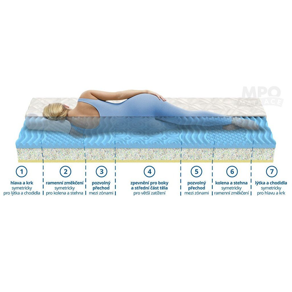 Partnerská matrace MPO Dita s nosností 120 kg a výškou 16 cm poslouží všem, kteří mají bolavá záda a klouby. Zajišťuje pohodlí na břichu, na boku i na zádech, po celou dobu spánku, který vás skutečně občerství. Pouhým otočením matrace můžete volit ze dvou tuhostí. Matrace Dita je zkonstruovaná pro zvýšenou zátěž. Její střed z rekonstituované PUR pěny zajišťuje vysokou životnost a nosnost. Vrstva visco elastické pěny na jedné straně matrace zvyšuje komfort ležení. Profilovaná vrstva z tepelně modifikované kvalitní PUR pěny na druhé straně má 7 anatomických zón: pro hlavu a krk, ramenní změkčení, pozvolný přechod, zpevnění pro boky a střední část těla, další přechod, kolena a stehna, lýtka a chodidla. Ideálním podkladem matrace Dita je rošt nebo pevná podložka.Jaký zvolit potah?Potah Medico – jedná se o velmi kvalitní a příjemnou strečovou látku, která je prošitá dutým vláknem. Tato látka zajistí maximální komfort a hygienu při spánku. Potah je opatřen děleným zipem pro snadnou údržbu, lze jej rozpůlit na dvě samostatné části a prát na 60°C.Potah Easy Clean – bílá strečová potahová látka je prošitá vrstvou PES rouna. Potah je příjemně měkký, čímž zvyšuje komfort ležení. Je také opatřen děleným zipem pro snadnou údržbu, lze jej rozpůlit na dvě samostatné části a prát i v menší pračce na 60°C, je také alergicky neutrální.Potah Aloe Vera – Látka potahu je prošitá vrstvou PES rouna. Do vláken potahové látky jsou vetkány výtažky z rostliny Aloe Vera, které mají antibakteriální účinky a zároveň posilňují relaxační efekt spánku. Jedná se o funkční potah, který je vhodný pro osoby trpící nadměrnou potivostí. Potah je opatřen zipem pro snadnou manipulaci a s možností rozdělit potah na 2 části a prát i v menší pračce na 60°C.Potah Bamboo – Díky potahu Bamboo s vysokým podílem přírodní viskozy matrace výborně reguluje vlhkost. Potah je pratelný až na 60 °C a opatřený děleným zipem pro snadné praní. Složení: 49% viskóza 51% polyester Prošev: 100% polyester.Potah Health Care – jedná se o vodonepropustný froté potah, který ochrání matraci před protečením tekutin. Tento potah zároveň propustí vodní páru, a tak umožňuje matraci „dýchat“. Matracový potah je velmi diskrétní, opatřený zipem. Může se vyvařovat a prát až na 95°C, je také alergicky neutrální.Potah Silver Active – jedná se o luxusní matracový potah s obsahem molekul stříbra, které zamezují tvorbě škodlivých bakterií. Kromě prevence vzniku plísní má také schopnost zabraňovat vzniku nepříjemného zápachu. Tento potah je prošit sedmidutinovým vláknem s výbornou tepelnou izolací. Je také opatřen děleným zipem pro snadnou údržbu, lze jej rozpůlit na dvě samostatné části a prát i v menší pračce na 60°C.Doplňkové parametry