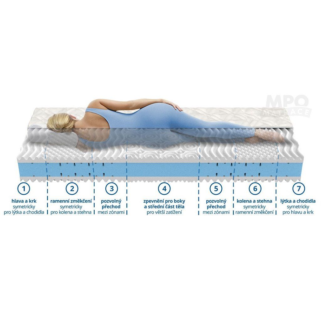Univerzální partnerská matrace MPO Elita 1+1 se 7 anatomickými zónami, nosností 120 kg a výškou 16 cm je pohodlná, výborně větratelná, s ideálním poměrem mezi cenou a kvalitou. PUR pěna, z které je vyrobena, zajišťuje dobrou oporu těla a tvarovou stálost. O vynikající ortopedické vlastnosti se stará střední vrstva matrace. Užívejte si každou minutu spánku anatomické zóny: pro hlavu a krk, ramenní změkčení, pozvolný přechod, zpevnění pro boky a střední část těla, další přechod, kolena a stehna, lýtka a chodidla. Všechny typy nabízených potahů k matraci MPO Elita 1+1 jsou alergicky neutrální a pratelné. Stačí si vybrat ten nejvhodnější pro vás. Ideálním podkladem matrace Elita je rošt nebo pevná podložka.Jaký zvolit potah?Potah Medico – jedná se o velmi kvalitní a příjemnou strečovou látku, která je prošitá dutým vláknem. Tato látka zajistí maximální komfort a hygienu při spánku. Potah je opatřen děleným zipem pro snadnou údržbu, lze jej rozpůlit na dvě samostatné části a prát na 60°C.Potah Easy Clean – bílá strečová potahová látka je prošitá vrstvou PES rouna. Potah je příjemně měkký, čímž zvyšuje komfort ležení. Je také opatřen děleným zipem pro snadnou údržbu, lze jej rozpůlit na dvě samostatné části a prát i v menší pračce na 60°C, je také alergicky neutrální.Potah Aloe Vera – Látka potahu je prošitá vrstvou PES rouna. Do vláken potahové látky jsou vetkány výtažky z rostliny Aloe Vera, které mají antibakteriální účinky a zároveň posilňují relaxační efekt spánku. Jedná se o funkční potah, který je vhodný pro osoby trpící nadměrnou potivostí. Potah je opatřen zipem pro snadnou manipulaci a s možností rozdělit potah na 2 části a prát i v menší pračce na 60°C.Potah Bamboo – Díky potahu Bamboo s vysokým podílem přírodní viskozy matrace výborně reguluje vlhkost. Potah je pratelný až na 60 °C a opatřený děleným zipem pro snadné praní. Složení: 49% viskóza 51% polyester Prošev: 100% polyester.Potah Health Care – jedná se o vodonepropustný froté potah, který ochrání matraci před protečením tekutin. Tento potah zároveň propustí vodní páru, a tak umožňuje matraci „dýchat“. Matracový potah je velmi diskrétní, opatřený zipem. Může se vyvařovat a prát až na 95°C, je také alergicky neutrální.Potah Silver Active – jedná se o luxusní matracový potah s obsahem molekul stříbra, které zamezují tvorbě škodlivých bakterií. Kromě prevence vzniku plísní má také schopnost zabraňovat vzniku nepříjemného zápachu. Tento potah je prošit sedmidutinovým vláknem s výbornou tepelnou izolací. Je také opatřen děleným zipem pro snadnou údržbu, lze jej rozpůlit na dvě samostatné části a prát i v menší pračce na 60°C.Doplňkové parametry
