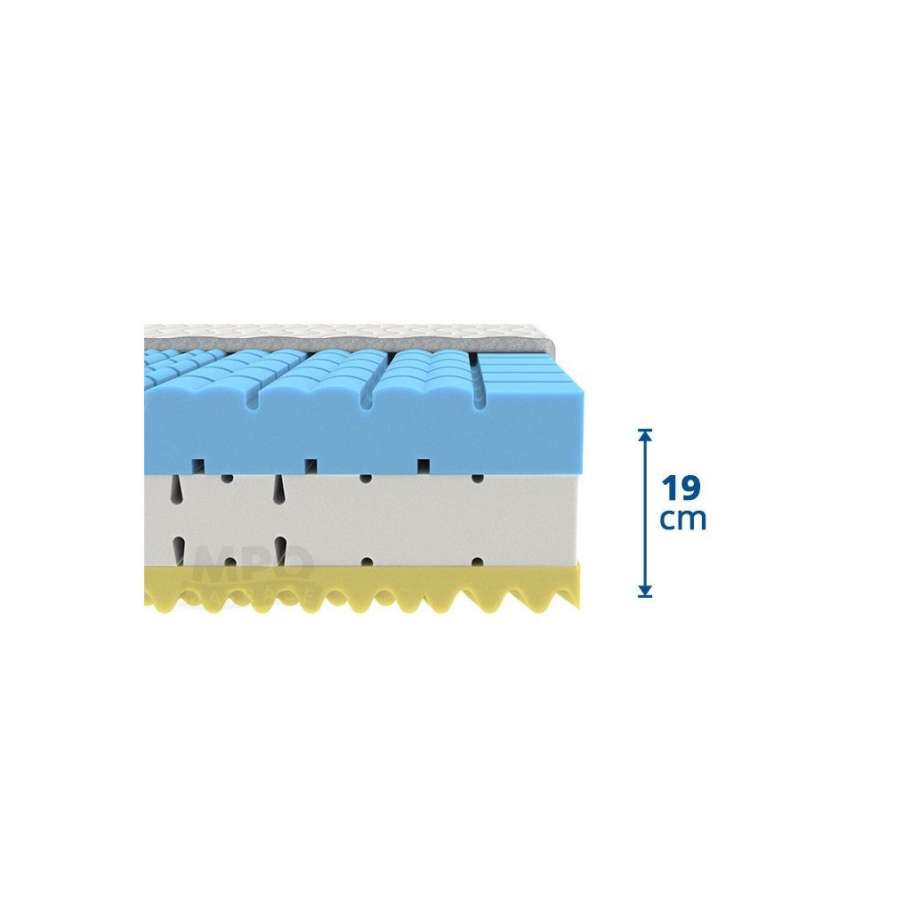 Zdravotní partnerská matrace MPO Loreta 1+1 výjimečné konstrukce vhodná i pro seniory. Každá strana matrace MPO Loreta má díky rozdílným materiálům jinou tuhost a můžete je měnit podle nálady, nebo aktuálního zdravotního stavu. Měkčí strana je vyrobena z visco elastické pěny, která aktivně reaguje na teplotu a tlak lidského těla. Tužší strana je z vysokohustotní HR studené pěny, prodyšné pro vodní páry a zachovává tak hygienu lůžka. Střed matrace z PUR pěny optimálně podporuje tělo. Souhra těchto faktorů zajistí váš zdravý spánek po celou noc. Všechny typy nabízených potahů k matraci Loreta jsou alergicky neutrální a pratelné. Stačí si vybrat ten nejlepší pro vás.Díky své výšce je vhodná i pro seniory. Lépe se na ni sedá a lépe se z ní vstává. Matrace MPO Loreta 1+1 se 7 anatomickými zónami a nosností 120 kg je zkonstruovaná speciálně pro lidi se zdravotními problémy. Výjimečná konstrukce matrace Loreta spočívá v rozdílných materiálech, a tím i tuhosti každé strany. Ty lze pak měnit podle nálady nebo aktuálního zdravotního stavu. Jaký zvolit potah?Potah Medico – jedná se o velmi kvalitní a příjemnou strečovou látku, která je prošitá dutým vláknem. Tato látka zajistí maximální komfort a hygienu při spánku. Potah je opatřen děleným zipem pro snadnou údržbu, lze jej rozpůlit na dvě samostatné části a prát na 60°C.Potah Easy Clean – bílá strečová potahová látka je prošitá vrstvou PES rouna. Potah je příjemně měkký, čímž zvyšuje komfort ležení. Je také opatřen děleným zipem pro snadnou údržbu, lze jej rozpůlit na dvě samostatné části a prát i v menší pračce na 60°C, je také alergicky neutrální.Potah Aloe Vera – Látka potahu je prošitá vrstvou PES rouna. Do vláken potahové látky jsou vetkány výtažky z rostliny Aloe Vera, které mají antibakteriální účinky a zároveň posilňují relaxační efekt spánku. Jedná se o funkční potah, který je vhodný pro osoby trpící nadměrnou potivostí. Potah je opatřen zipem pro snadnou manipulaci a s možností rozdělit potah na 2 části a prát i v menší pračce na 60°C.Potah Bamboo – Díky potahu Bamboo s vysokým podílem přírodní viskozy matrace výborně reguluje vlhkost. Potah je pratelný až na 60 °C a opatřený děleným zipem pro snadné praní. Složení: 49% viskóza 51% polyester Prošev: 100% polyester.Potah Health Care – jedná se o vodonepropustný froté potah, který ochrání matraci před protečením tekutin. Tento potah zároveň propustí vodní páru, a tak umožňuje matraci „dýchat“. Matracový potah je velmi diskrétní, opatřený zipem. Může se vyvařovat a prát až na 95°C, je také alergicky neutrální.Potah Silver Active – jedná se o luxusní matracový potah s obsahem molekul stříbra, které zamezují tvorbě škodlivých bakterií. Kromě prevence vzniku plísní má také schopnost zabraňovat vzniku nepříjemného zápachu. Tento potah je prošit sedmidutinovým vláknem s výbornou tepelnou izolací. Je také opatřen děleným zipem pro snadnou údržbu, lze jej rozpůlit na dvě samostatné části a prát i v menší pračce na 60°C.Doplňkové parametry