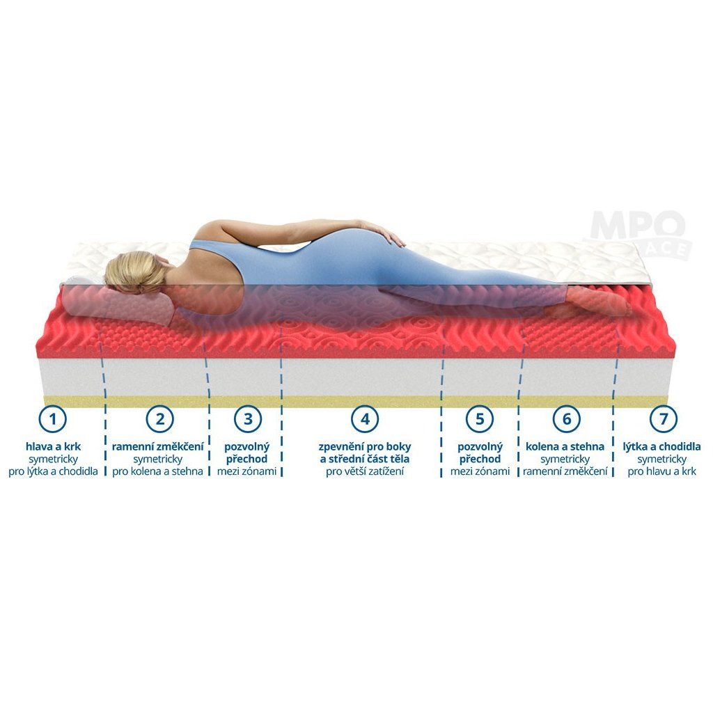 7-zónová partnerská matrace Memory Comfort je vysoká 20 cm a má vynikající ortopedické vlastnosti. Je zdravotní, takže je vhodná pro osoby s bolestmi zad a kloubů. Matrace Memory Comfort je tvořena různě tuhými Visco a PUR pěnami, proto je vhodná jako partnerská matrace, kdy si každý si zvolí lépe vyhovující tuhost. Za uvedenou cenu obdržíte dvě matrace a dva polštářky. Jak je produkt Ortopedická matrace 1+1 MEMORY COMFORT vyrobena? Matrace Memory Comfort 1+1 se 7 anatomickými zónami a nosností 120 kg má vynikající ortopedické vlastnosti. Silná vrstva kvalitní viscoelastické pěny zajistí dokonalé vnoření těla do matrace a výbornou oporu svalů a páteře. Je vhodná při bolestech zad, krční páteře a při problémech s bolestivostí kloubů. Druhá strana z tepelně modifikované PUR pěny je rozdělena do 7 anatomických zón. Díky výšce 20 cm vyhovuje tato matrace například seniorům, protože umožňuje snadnější usedání i vstávání. Výjimečná konstrukce matrace Memory Comfort spočívá v rozdílných materiálech, a tím i tuhosti každé strany. Ty lze pak měnit podle nálady nebo aktuálního zdravotního stavu. Všechny typy nabízených potahů k matraci Memory Comfort jsou alergicky neutrální a pratelné. Stačí si vybrat ten nejlepší pro vás, abyste se mohli těšit ze zdravého a posilujícího spánku po celou noc. Jaký zvolit potah? Potah Medico – jedná se o velmi kvalitní a příjemnou strečovou látku, která je prošitá dutým vláknem. Tato látka zajistí maximální komfort a hygienu při spánku. Potah je opatřen děleným zipem pro snadnou údržbu, lze jej rozpůlit na dvě samostatné části a prát na 60°C. Potah Easy Clean – bílá strečová potahová látka je prošitá vrstvou PES rouna. Potah je příjemně měkký, čímž zvyšuje komfort ležení. Je také opatřen děleným zipem pro snadnou údržbu, lze jej rozpůlit na dvě samostatné části a prát i v menší pračce na 60°C, je také alergicky neutrální. Potah Aloe Vera – Látka potahu je prošitá vrstvou PES rouna. Do vláken potahové látky jsou vetkány výtažky z rostliny Aloe Vera, které mají antibakteriální účinky a zároveň posilňují relaxační efekt spánku. Jedná se o funkční potah, který je vhodný pro osoby trpící nadměrnou potivostí. Potah je opatřen zipem pro snadnou manipulaci a s možností rozdělit potah na 2 části a prát i v menší pračce na 60°C. Potah Bamboo – Díky potahu Bamboo s vysokým podílem přírodní viskozy matrace výborně reguluje vlhkost. Potah je pratelný až na 60 °C a opatřený děleným zipem pro snadné praní. Složení: 49% viskóza 51% polyester Prošev: 100% polyester. Potah Health Care – jedná se o vodonepropustný froté potah, který ochrání matraci před protečením tekutin. Tento potah zároveň propustí vodní páru, a tak umožňuje matraci „dýchat“. Matracový potah je velmi diskrétní, opatřený zipem. Může se vyvařovat a prát až na 95°C, je také alergicky neutrální. Potah Silver Active – jedná se o luxusní matracový potah s obsahem molekul stříbra, které zamezují tvorbě škodlivých bakterií. Kromě prevence vzniku plísní má také schopnost zabraňovat vzniku nepříjemného zápachu. Tento potah je prošit sedmidutinovým vláknem s výbornou tepelnou izolací. Je také opatřen děleným zipem pro snadnou údržbu, lze jej rozpůlit na dvě samostatné části a prát i v menší pračce na 60°C.Doplňkové parametry