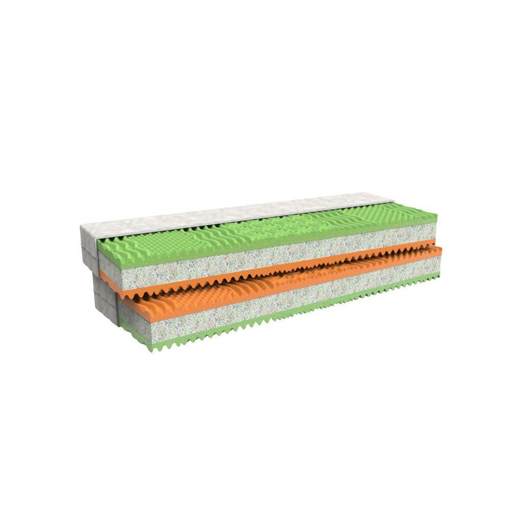 Střed partnerské matrace 1+1 Regina s nosností 120 kg a výškou 16 cm tvoří zátěžová vrstva pojené PUR pěny, která poskytuje optimální pevnost a zabraňuje nepřirozenému křivení páteře. Lehací plochy matrace jsou profilované do 7 anatomických zón, což zajišťuje perfektní odvětrání: pro hlavu a krk, ramenní změkčení, pozvolný přechod, zpevnění pro boky a střední část těla, další přechod, kolena a stehna, lýtka a chodidla. Reginu ocení uživatelé, jejichž zádům vyhovují spíše tvrdší matrace. Všechny typy nabízených potahů k matraci Regina jsou alergicky neutrální a pratelné. Stačí si vybrat ten nejlepší pro vás, abyste se každou noc mohli těšit ze zdravého spánku. Jako oporu matrace si vyberte rošt či pevnou podložku.Doplňkové parametry
