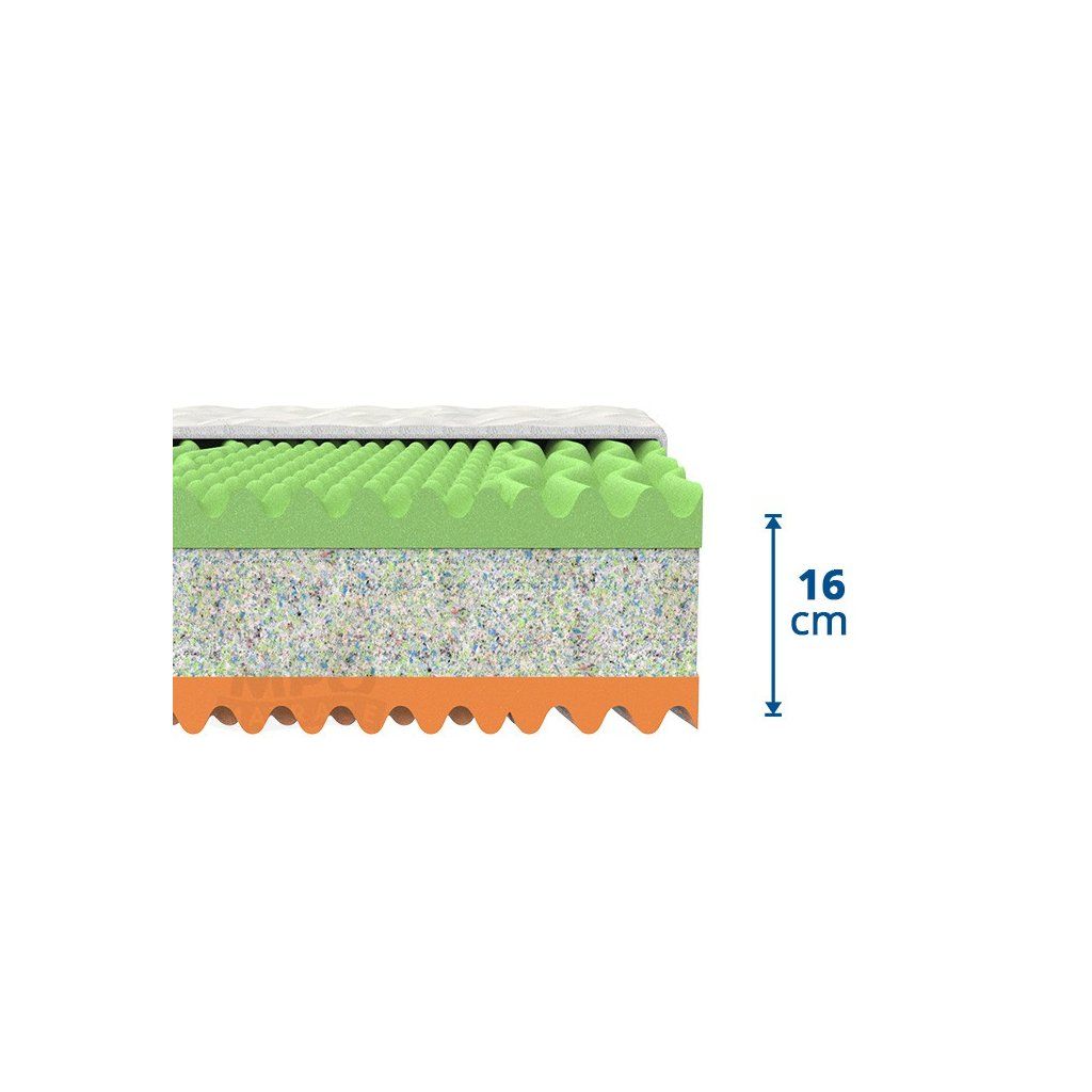 Střed partnerské matrace 1+1 Regina s nosností 120 kg a výškou 16 cm tvoří zátěžová vrstva pojené PUR pěny, která poskytuje optimální pevnost a zabraňuje nepřirozenému křivení páteře. Lehací plochy matrace jsou profilované do 7 anatomických zón, což zajišťuje perfektní odvětrání: pro hlavu a krk, ramenní změkčení, pozvolný přechod, zpevnění pro boky a střední část těla, další přechod, kolena a stehna, lýtka a chodidla. Reginu ocení uživatelé, jejichž zádům vyhovují spíše tvrdší matrace. Všechny typy nabízených potahů k matraci Regina jsou alergicky neutrální a pratelné. Stačí si vybrat ten nejlepší pro vás, abyste se každou noc mohli těšit ze zdravého spánku. Jako oporu matrace si vyberte rošt či pevnou podložku.Doplňkové parametry