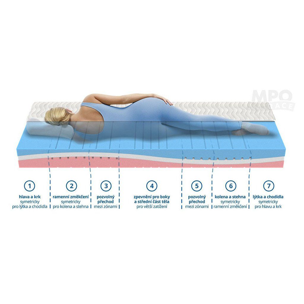 Matrace Variant 1+1 od firmy MPO je vyrobena z kvalitních a prodyšných materiálů. Partnerská matrace, která vám umožňuje nejen výběr tuhosti stran podle typu pěn, ale díky speciální konstrukci a vlně ve středu matrace nabízí každá strana různé tuhosti v ramenní oblasti. Každý si najde své pohodlí pro dokonalý spánek. Celkem 4 různé tuhosti pod ramenem. 7 zónový systém matrace MPO Variant 1+1 v kombinaci s použitými materiály optimalizuje pozici těla při spánku pro odpočinek a uvolnění po celodenní námaze. Orientační výška matrace je 18 cm (může se lišit podle typu potahové látky).Jaký zvolit potah?Potah Medico – jedná se o velmi kvalitní a příjemnou strečovou látku, která je prošitá dutým vláknem. Tato látka zajistí maximální komfort a hygienu při spánku. Potah je opatřen děleným zipem pro snadnou údržbu, lze jej rozpůlit na dvě samostatné části a prát na 60°C.Potah Easy Clean – bílá strečová potahová látka je prošitá vrstvou PES rouna. Potah je příjemně měkký, čímž zvyšuje komfort ležení. Je také opatřen děleným zipem pro snadnou údržbu, lze jej rozpůlit na dvě samostatné části a prát i v menší pračce na 60°C, je také alergicky neutrální.Potah Aloe Vera – Látka potahu je prošitá vrstvou PES rouna. Do vláken potahové látky jsou vetkány výtažky z rostliny Aloe Vera, které mají antibakteriální účinky a zároveň posilňují relaxační efekt spánku. Jedná se o funkční potah, který je vhodný pro osoby trpící nadměrnou potivostí. Potah je opatřen zipem pro snadnou manipulaci a s možností rozdělit potah na 2 části a prát i v menší pračce na 60°C.Potah Bamboo – Díky potahu Bamboo s vysokým podílem přírodní viskozy matrace výborně reguluje vlhkost. Potah je pratelný až na 60 °C a opatřený děleným zipem pro snadné praní. Složení: 49% viskóza 51% polyester Prošev: 100% polyester.Potah Health Care – jedná se o vodonepropustný froté potah, který ochrání matraci před protečením tekutin. Tento potah zároveň propustí vodní páru, a tak umožňuje matraci „dýchat“. Matracový potah je velmi diskrétní, opatřený zipem. Může se vyvařovat a prát až na 95°C, je také alergicky neutrální.Potah Silver Active – jedná se o luxusní matracový potah s obsahem molekul stříbra, které zamezují tvorbě škodlivých bakterií. Kromě prevence vzniku plísní má také schopnost zabraňovat vzniku nepříjemného zápachu. Tento potah je prošit sedmidutinovým vláknem s výbornou tepelnou izolací. Je také opatřen děleným zipem pro snadnou údržbu, lze jej rozpůlit na dvě samostatné části a prát i v menší pračce na 60°C.Doplňkové parametry