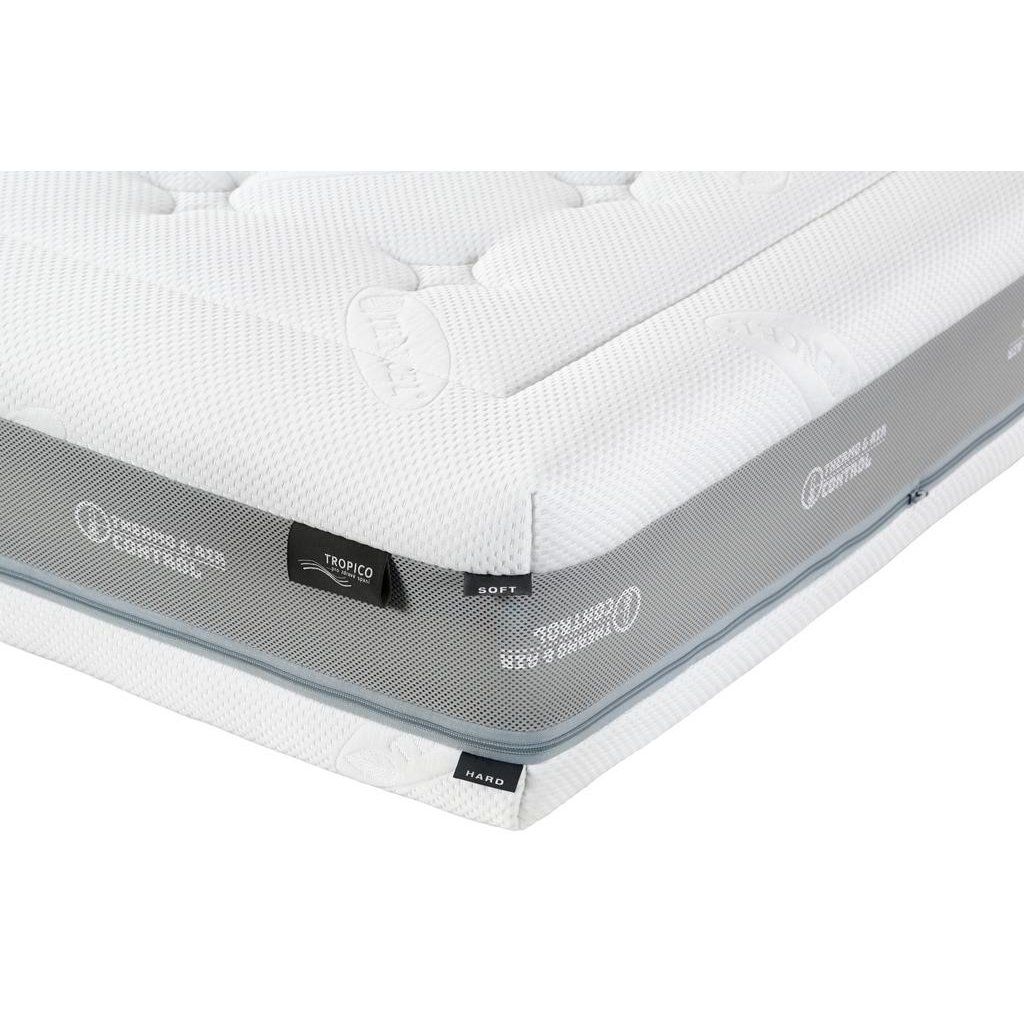 Ortopedická partnerská matrace Austin Air GelTouch od firmy Tropico je komfortní sedmizónová matrace s taštičkovou konstrukcí z deskami z latexu a studené pěny, výškou 26 cm a nosností do 145 kg. Pružiny nejsou vzájemně propojeny, samostatně reagují na zatížení. Pro svalovou relaxaci a úlevu kloubů je na ložných plochách použit latex a studená pěna. Partnerská matrace s rozdílnou tuhostí stran má vynikající ortopedické vlastnosti, je vzdušná, pružná a stabilní.Konstrukce matraceHybridní pěna GelTouch - strana soft - fialová pěna - spojuje hebkost latexu s dokonalou distribucí tlaku gelových matrací. Vysoce prodyšná, napomáhá správné termoregulaci.Studená pěna - na měkčí straně (růžová pěna) je použitá velice pružná studená pěna Medium cca 3 cm. Výborná odrazová pružnost pro snadné otáčení.Izolační vrstva - Filc - šedá barva - izolační a roznášecí vrstva.Multipocket taškové pružiny - vysoce vzdušné a elastické 7-zónové jádro MultiPocket z cca 555 pružin na 1 m2. Pružinové jádro je vyztuženo v bocích masivními zpevňovacími partiemi z pěny Flexifoam, která zajišťuje oporu při vstávání z postele a stabilitu jádra matrace a tím i celého lůžka.Kokosová deska - hnědá barva - roznášecí deska o výšce 1cm z lisovaného kokosového vlákna. Dodává matraci tuhost, odolnost a stabilitu.Studená pěna - bílá pěna - pružnost a tuhost - tužší strana matrace disponuje sendvičem dvou studených pěn rozdílné tuhosti.Potah Tencel s Thermo Air Control - pratelný prošívaný potah s přírodními vlákny. Odolný sněhově bílý potah Tencel® Lyocell® s vynikající termoregulací a přírodními vlákny. Pratelný (60 °C), dvojdílný, prošitý extra silnou klimatizační vrstvou dutého vlákna. Moderní ornamentální vzor prošívání skvěle drží tvar. Technologie Thermo&Air Control. Žádný trik. Speciální odvětrávací systém potahu skvěle spolupracuje s jádrem matrace. Zajišťuje termoregulaci, tedy spánek bez přehřívání a pocení či přílišného ochlazování. Pomáhá udržet lůžko suché a hygienicky čisté.Vhodné na pevné lamelové rošty, laťkové rošty.Doporučená maximální nosnost do 145 kgVýška matrace cca 26 cmProdloužená záruka 7 let na jádro matrace150.000 mechanických zátěžových testůProdloužená záruka jádra matrace: pro získání prodloužené záruky je potřeba matraci do 30 dnů od nákupu registrovat v tomto formuláři. Pokud se nezaregistrujete, máte nárok na standardní 2letou záruku.Doplňkové parametry